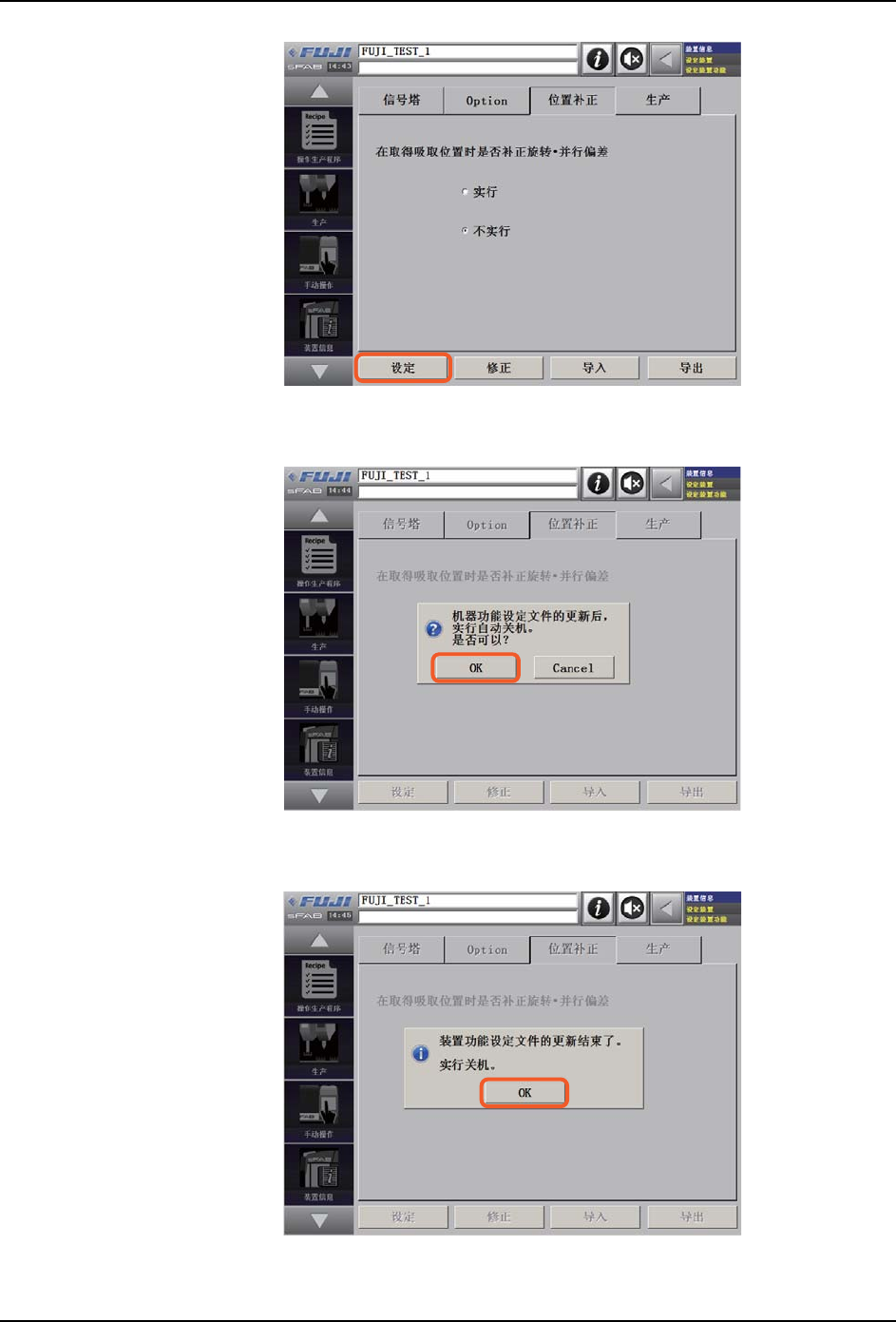 OPE-SFAB-005S0 9. 系统管理 SmartFAB 操作手册 209 4. 机器功能设定的文件被更新,显示执行关机的对话框, 请按下 [OK]。 5. 重新启动装置后,确认各标签页的 设定是否反映出来,完成 Optio n、位置补正的装置功 能设定步骤。 39OPE-0396-S CoaQ1DBp CoaQ1DBp Downloaded at 2015/10/08 22:10:586 by 3NEC4804 DL#XBovD…