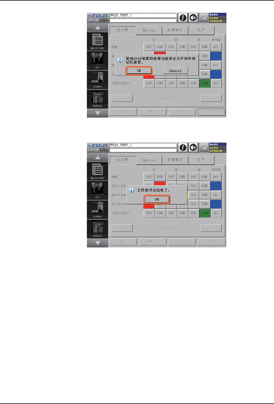 OPE-SFAB-005S0 9. 系统管理 SmartFAB 操作手册 215 <导入后> 5. 机器重新启动后,确认各标签页的设定被反映了,机器 信息的导入步骤结束。 9.3.8 导出机器功能设定 1. 连接想要保存机器功能设定的 U 盘。 2 . 按 下[导 出] 。 39OPE-0268-S 39OPE-0275-S CoaQ1DBp CoaQ1DBp Downloaded at 2015/10/08 22:10:586 by …