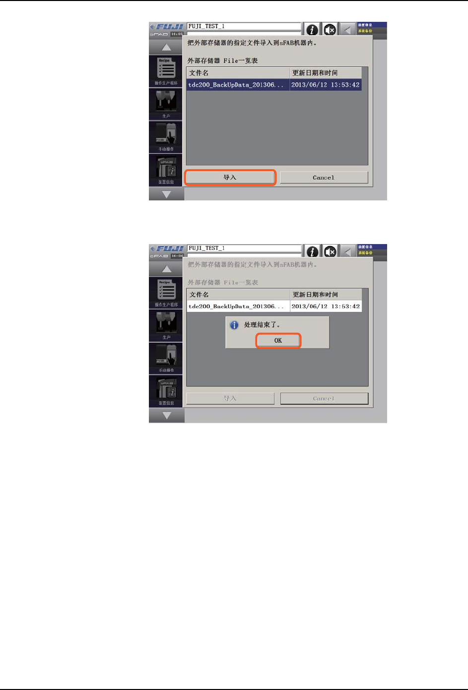 9. 系统管理 OPE-SFAB-005S0 264 SmartFAB 操作手册 9.12.3 系统数据的导入步骤 1. 将保存了备份文件的 U 盘插到机器上。 备注 )导入时的参照地址为 \fuji\sFAB_data\Backup。 2. 请在系统备份画面上点击 [ 导入 ] 键。 3. 画面中会显示可导入的文件一览。请从中选择需导入的 文件。 39OPE-0338-S 39OPE-0339-S CoaQ1DBp CoaQ1DBp …