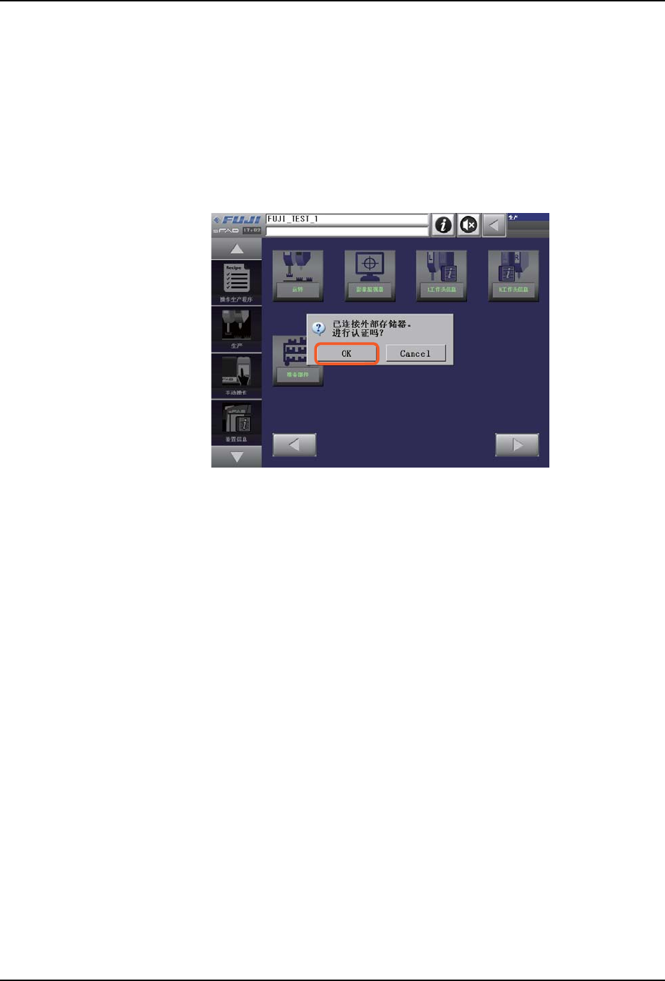 10. 附录 OPE-SFAB-005S0 270 SmartFAB 操作手册 10.2 关于带安全功能型 U 盘 机器上连接着带安全功能的 U 盘时, 如果进行了安全认证, 与没有带安全功能的 U 盘相同能 够使用。 10.2.1 执行安全认证 1. 将带安全功能的 U 盘连接到机器上。机器检测出连接后,就会显示确认画面 。如果要进 行安全认证,请 按下 [OK]。 按下 [Cancel] 则不进行安全 认证。 注意 )再次进行安全认…