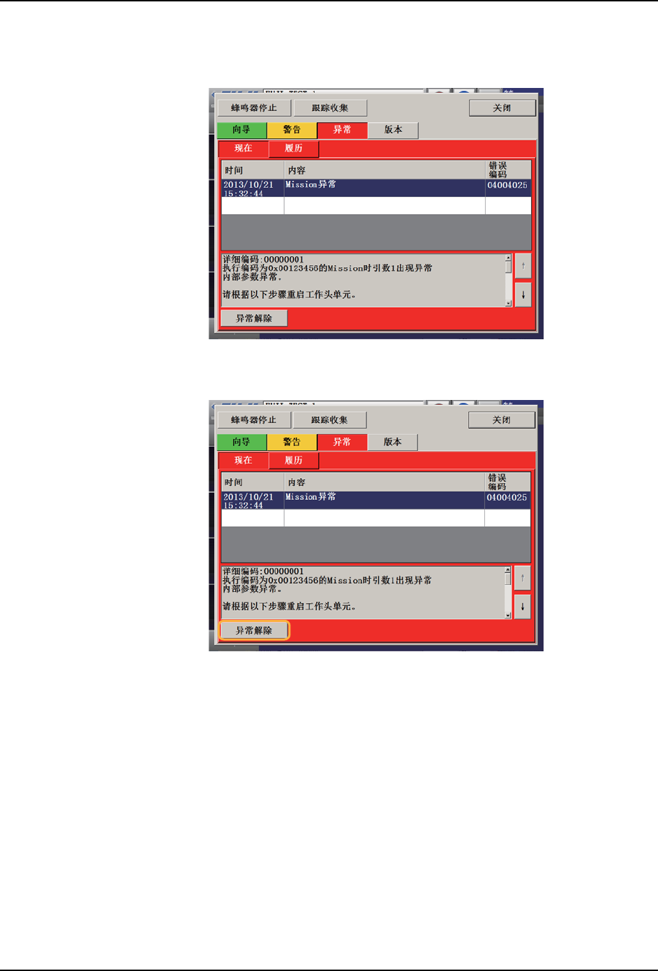 3. 按下 [异常解除]按钮,恢复到通常的生产。