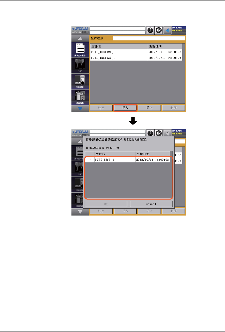 3. 按下切换生产程序画面上的 [导入]按钮。在弹出画面上,显示 U 盘内保存的生产程序