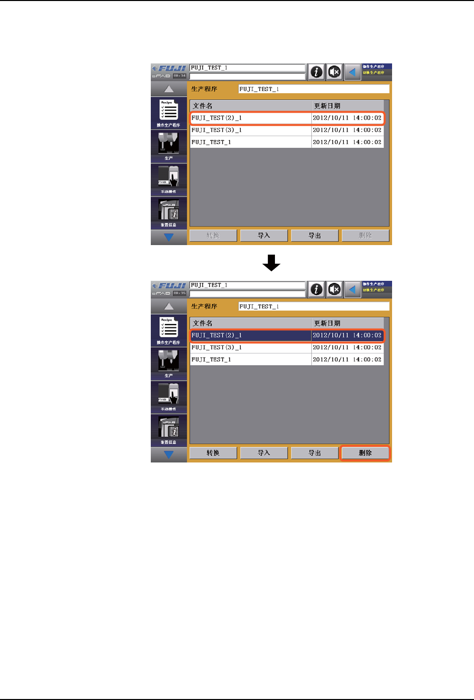 1. 在切换生产程序画面上,请选择要删除的生产程序,按下 [删除]。