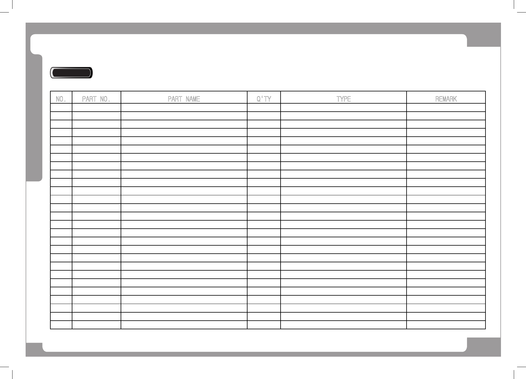 NO. PART NO. PART NAME Q'TY TYPE REMARK