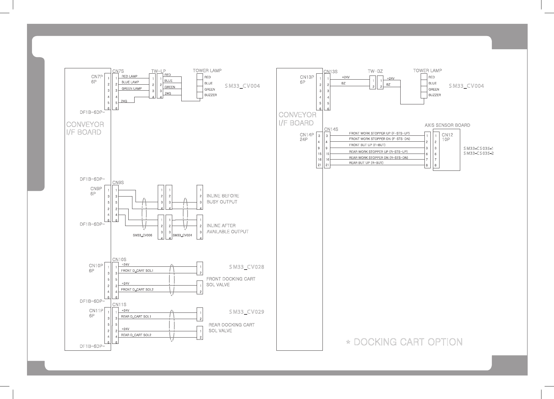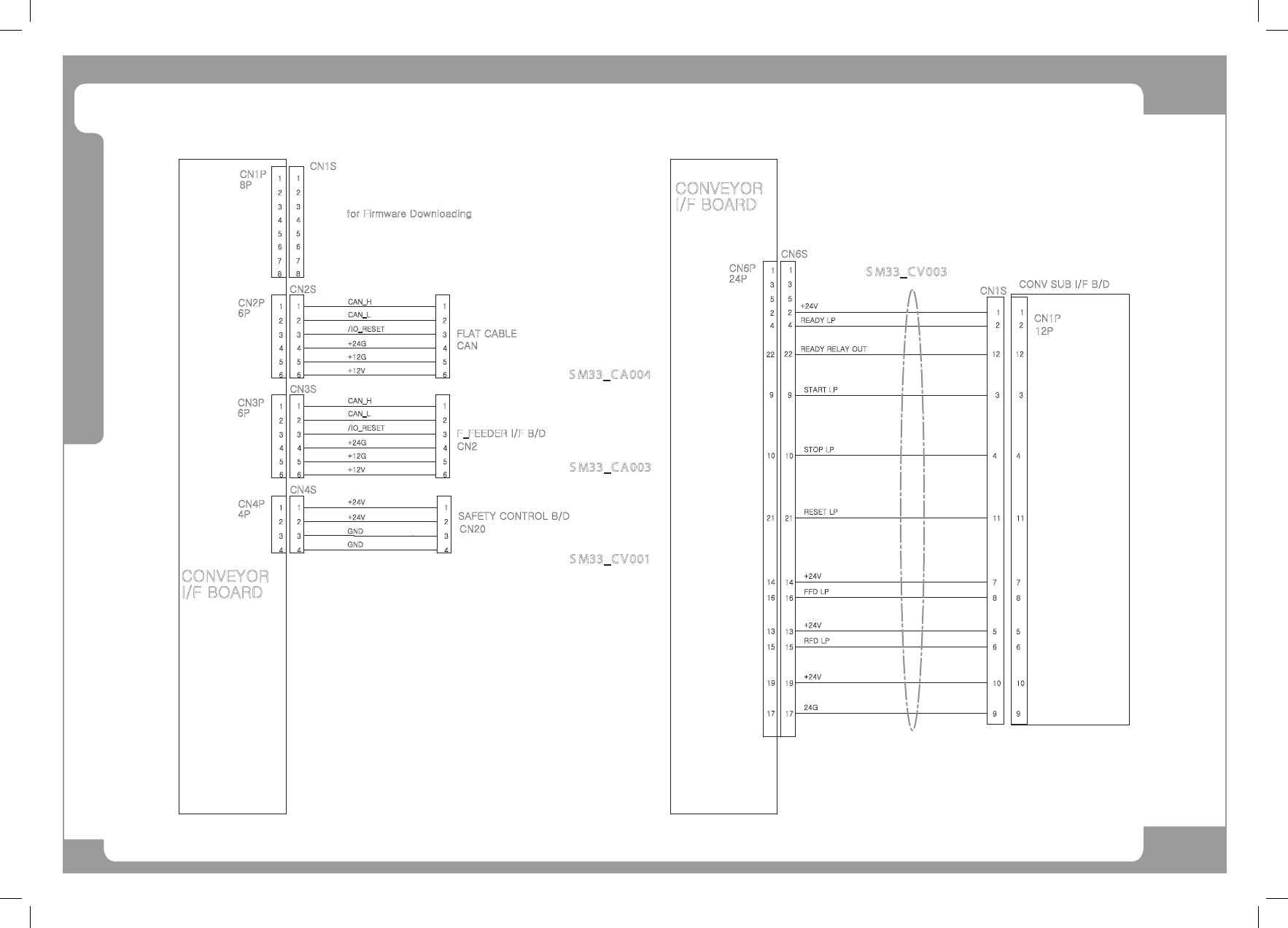 Page SAMSUNG TECHWIN 88 SM411 C on ve yor B oar d Int er fac e (1/ 5) 1 3 2 1 3 2 I/F BOARD +24V GND GND +24V /IO_RESET +24G +12G +12V CAN_H CAN_L CAN_H CAN_L /IO_RESET +24G +12G +12V 4 5 6 4 5 6 4P CN4P 6P CN3P 4 5 6 4 …