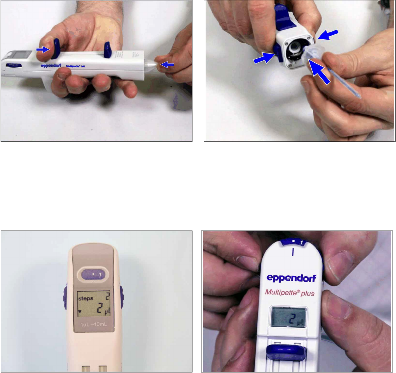 Filling a nd Setting the Multipette (Version V1 & V2) Cover y our working s urface wit h a cloth or someth ing similar , to preven t it fro m being soi led with greas e when you s et the M ultipette. Push the b i…