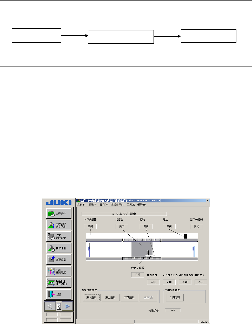 第 1 部 基本篇 第 2 章 生产 2- 7 生产准备 < 步骤 > 2-7-1 基板的设置 这里要讲述的是 ,如何在“生产”个 别控制画面 ※ 1 进行各项设置。 *1 :生产个别控制画面是指:按下“生产” — “传送· I/O 状态”画面内 的“个别控制” 按钮,利 用其功能来安排 传送工作。有关个别 控制的详细说明,请 参见第 7 章。 (注意) :要启动“生产 ”功能 ,需要读入生 产程序。 2-7-1-1 传送轨…