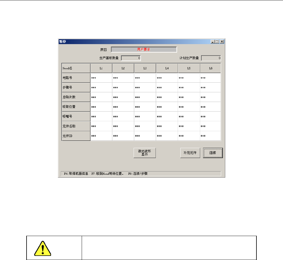 在生产运行中(XY轴移动中)检测出送料器悬浮时,会显示如下信息,并进入暂停状态。