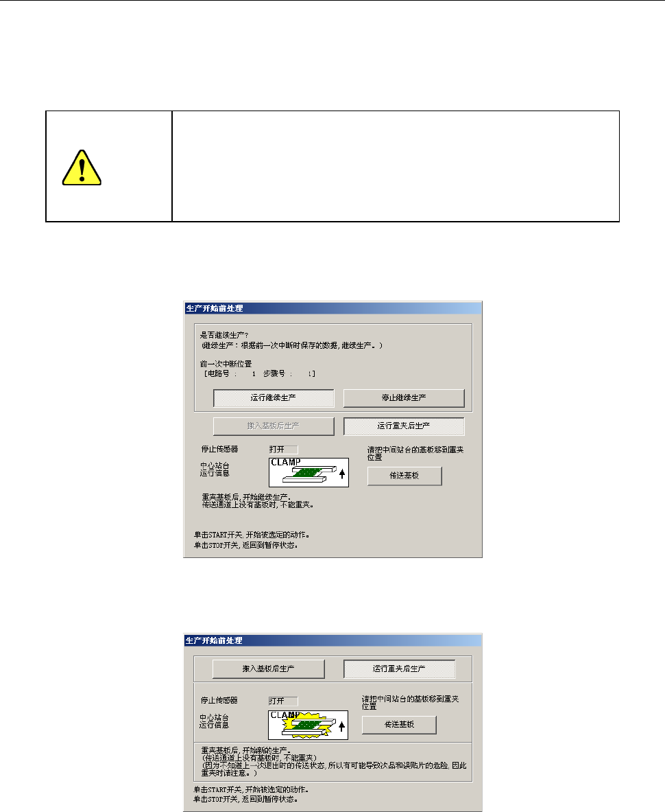 开始生产时传送道上已有基板时重新夹紧基板,在不搬入基板的情况下开始的生产称为“无传
