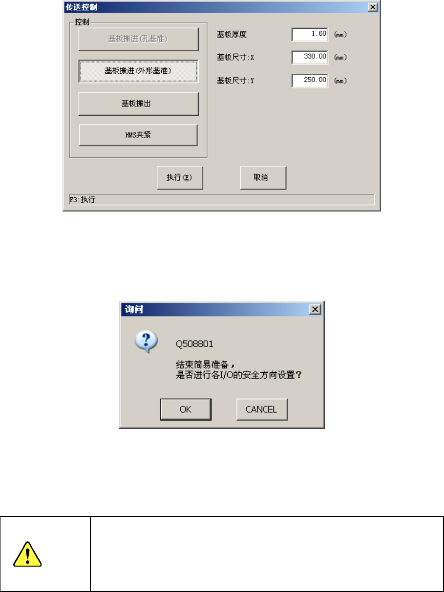 第 1 部 基本篇 第 2 章 生产 在“传送”标签 上按下设置或控制项 目按钮后,会显示与 按钮对应的设置或 控制对话框。 请在对话矿上进 行相应的设置、或控 制操作。 图 2-12-3-2-2 传送操作 ( 控制用对话框示例 ) 按下 “简易准备” 对话框的 “确定” 按钮时, 或按下对话框的 “关闭 ( x ) ” 按钮等关闭对话框时 , 显示进行各 I/O 的安全方向设置的询 问对话框。 图 2-12-3-2- 3 I/O 安全…