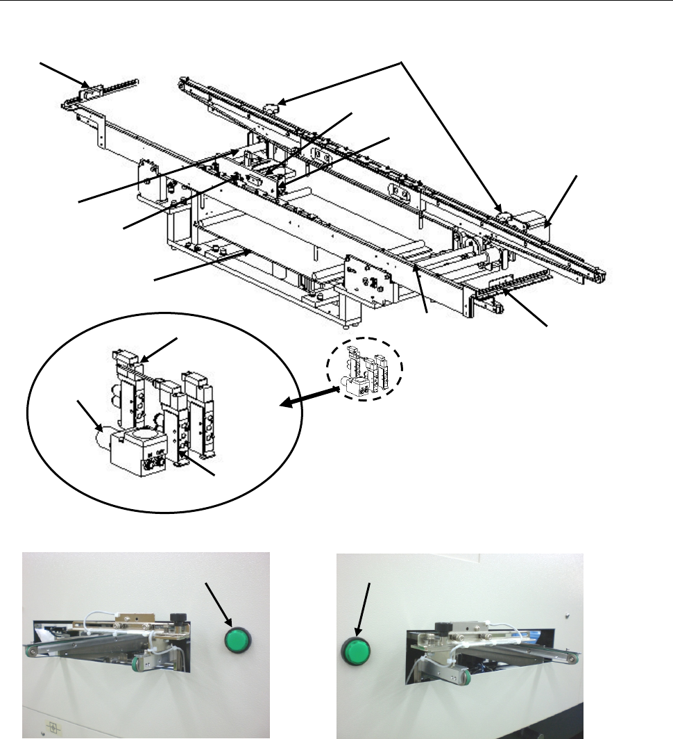 第 1 部 基本编 第 1 章 设备概要 ① 搬入 传感器 ⑨ 传送宽度调整 手轮 ② 停止 传感器 ⑩ 减压 阀(支撑台用 ) ③ 止动 器 ⑪ 驱动 轴 ④ 支撑 台 UP 传 感器 ⑫ 搬出 传感器 ⑤ 支撑 台 DOWN 传感器 ⑬ 止动 器 电磁阀 ⑥ 支撑 台 电磁阀 ⑭ 传送 指示器( 左 侧) ⑦ 传送马达 ⑮ 传送 指示器( 右 侧) ⑧ 支撑 台 基板要插入 传送 通道时, 由位于 传送 通道入口附近的 传送 指示器…