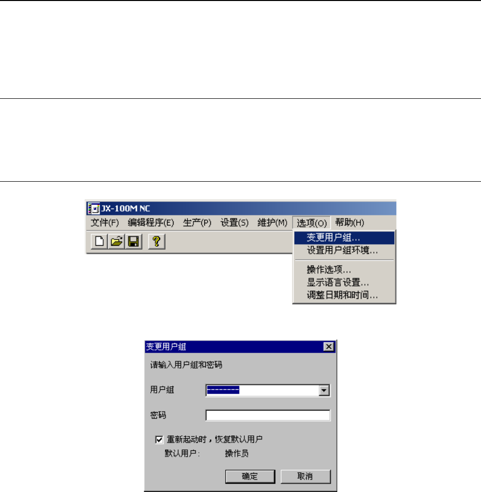 第 1 部 基本篇 第 4 章 制作生产程序 4-2 选项 选项菜单根据用 户的使用目的· 状况, 设置了各种功能, 提供了相应的设置 。本节 将对“变更 用 户组”、“设置 用户组环境”、“调 整时间和日期”、“ 显示语言设置” ( *1 ) 进行说明。 另外,有关“操 作选项”的说明,请 参见“第 5 章 : 操作选 项”。 *1 英文版操作系统及英 文版机器软件 不能使用“设置选择 显示语言功能 ”。 4-2-1 用户组(用户级别…