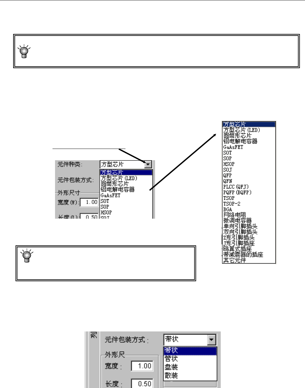 从显示的包装方式一览表中选择元件供给装置的种类。需要进行变更时,请从下拉式一览表中选