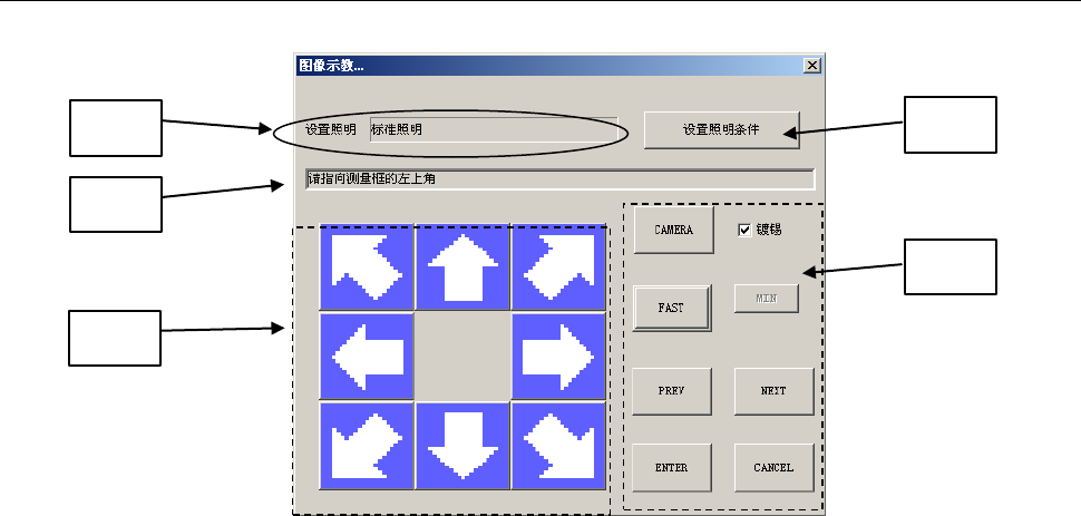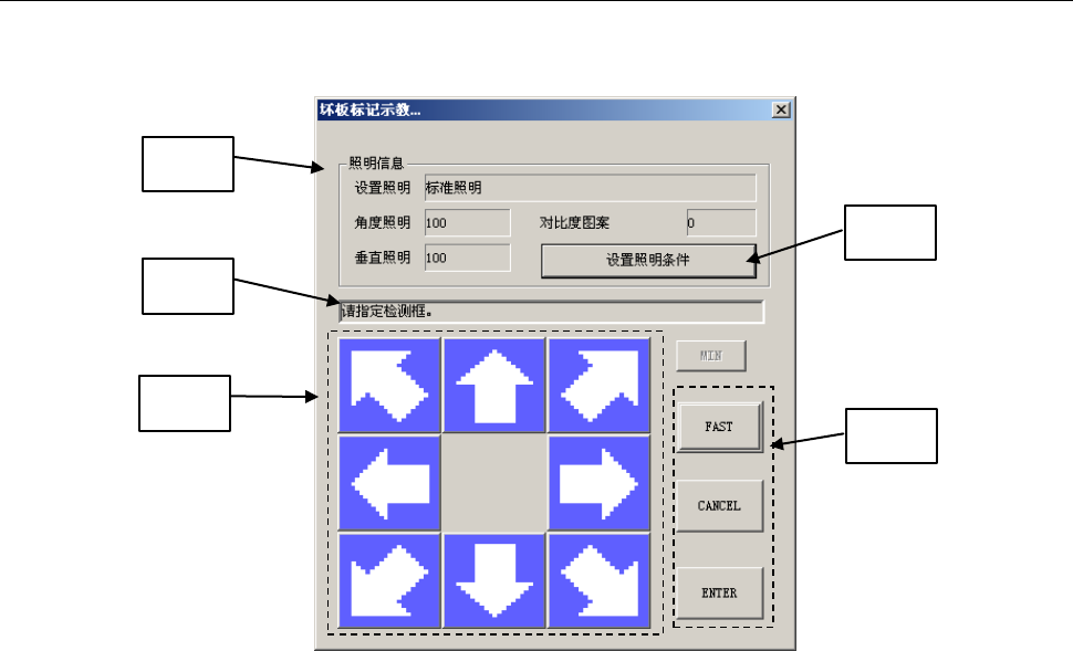 第 1 部 基本篇 第 4 章 制作生产程序 4-5-2-6 OCC 坏板标记示教 有关 OCC 坏板 标记示教操作 的详情,请 参见 6-5-8 章。 图 4-5-2-6-1 OCC 坏板标 记示教 ①照明信息 显示当前设置的照明 设置。 ②信息 显示信息。(例如, 「请指定检出框」等 ) ③移动按钮 移动监视器里显示的 检出框。 ④设置照明条件 按钮 显示照明条件设置对 话框,对照明条件进 行设置。 ⑤[ FAST ]按钮 在选择此…