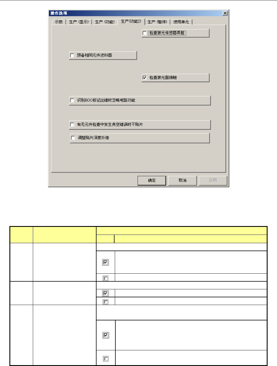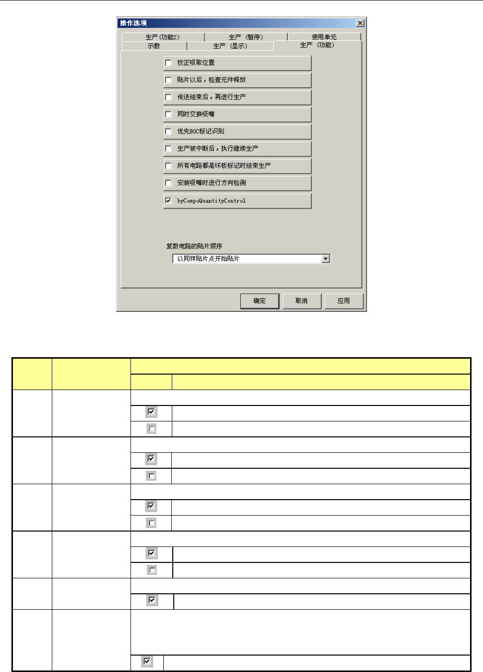 第 2 部 功能详细编 第 5 章 操作选项 7 所有电路都是 坏板标记时结 束生产 设置在所有电路 识别出坏板标 记时,是否中断生产 。 即使生产未达到 预定数量,也 要结束生产。因为可以 推断是“坏板 标 记位置信息错误 ” 、 “传感器的调整不 良或故障”等出现异 常。 8 安装吸嘴时进 行方向检测 设置安装吸嘴时 是否执行方向 检测。 T 型 等吸嘴需要对准元件 的角度吸取 ,可在安装吸嘴时测 量吸嘴的安 装方向,对吸取、识别、…