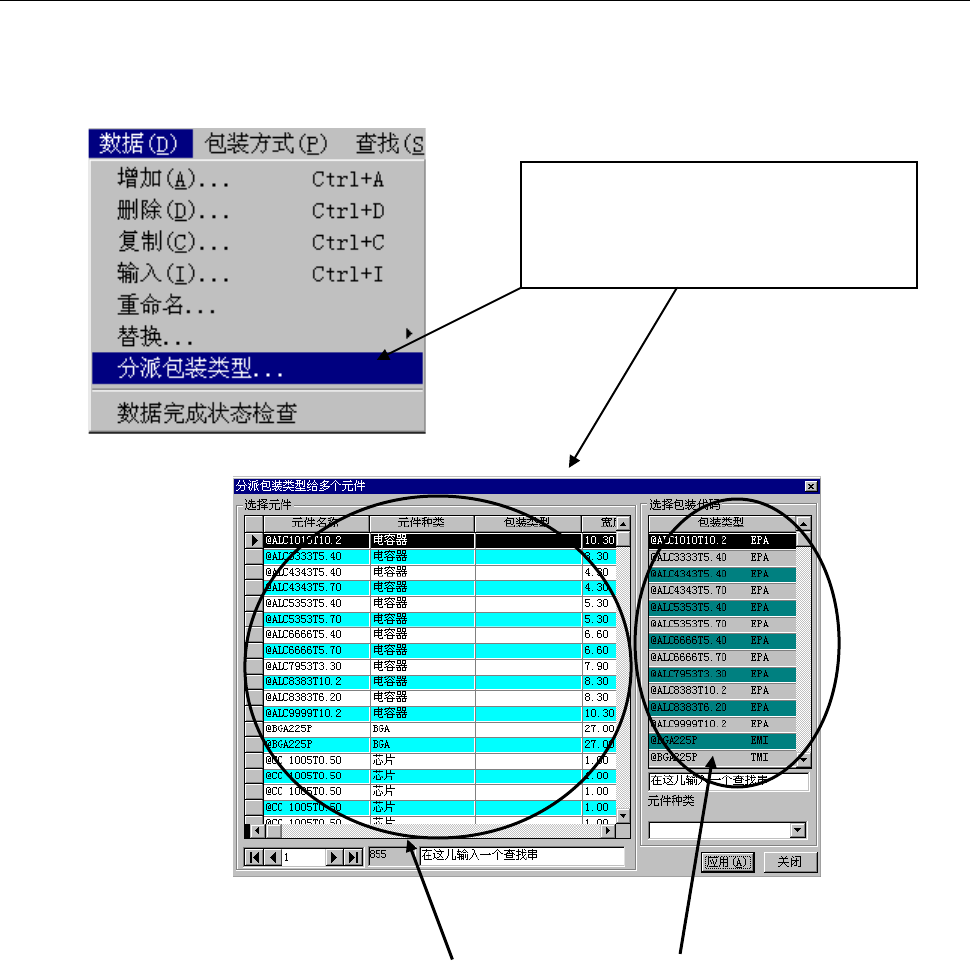 第 2 部 功能详细篇 第 11 章 数据库 11-4-6 分派包装类型 可以对多个元件 数据统一设置包装类 型。 1) 在“数据”菜单中选择“ 分派包装类型 … ”后 ,会显示如下画面。 在“分派包装类型” 画面上, 会显示元件数据 清单表和包装类型一 览表。 图 11.4.6-1 元件数据清单 包装类型清单 图 5.4.6-2 点击 “分派包装类型” 后 , 可显示 “分派 包装类型给多个元件”画面。 11 - 20