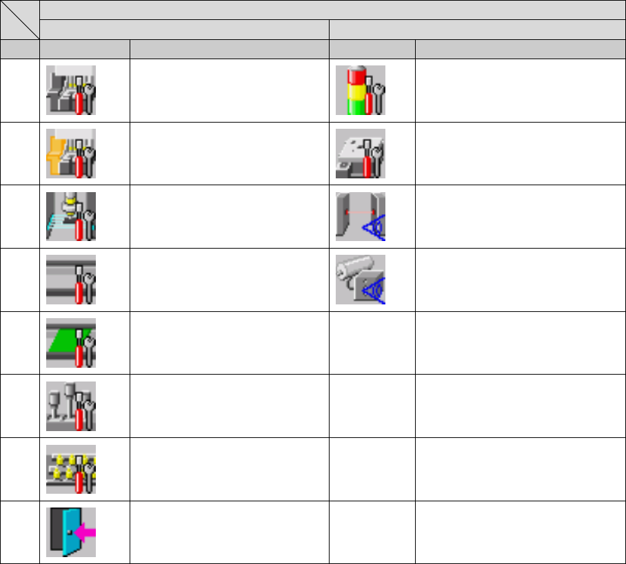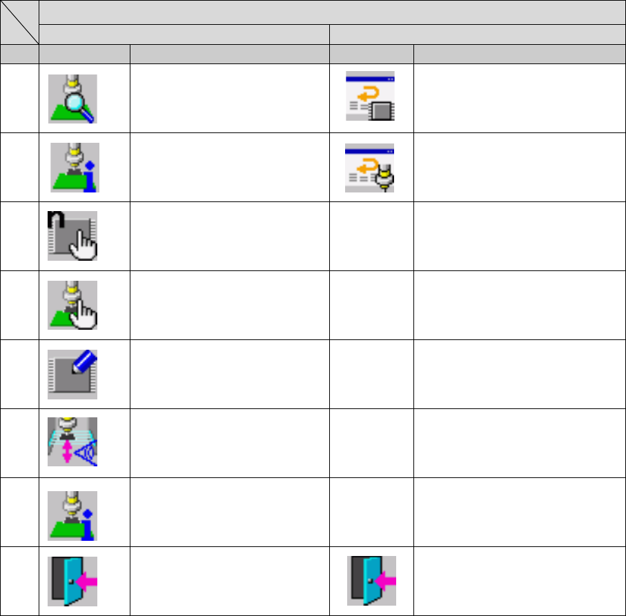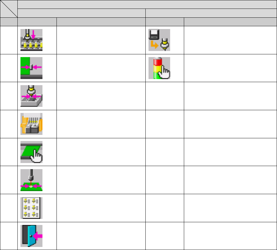 第 1 部 基本编 第 1 章 设备概要 1-4-2-3 机器设置 换页 第一页 第二页 No. 图标 名称 图标 名称 1 ATC 吸嘴分配 读取吸嘴数据 2 外形基准的位置 信号灯 3 元件废弃位置 4 使用单元 5 基板传送 6 坏板标记示教 进行坏板标记的 示教。 7 已注册吸嘴一览 8 退出 返回桌面。 1- 59