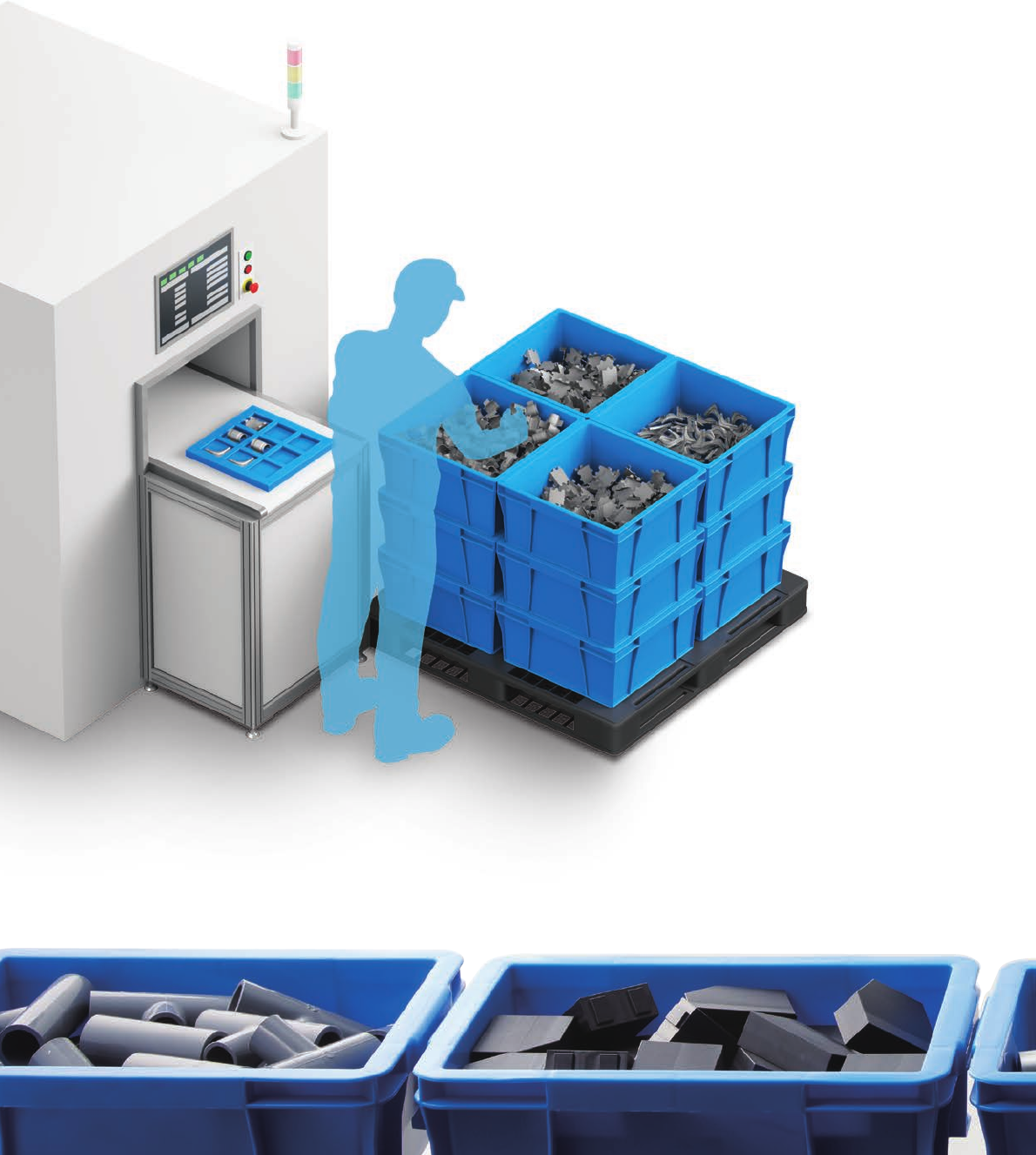 该作业要求工人根据部件的交货形态和地点,判断部件的形状,取出部件并排放整齐。