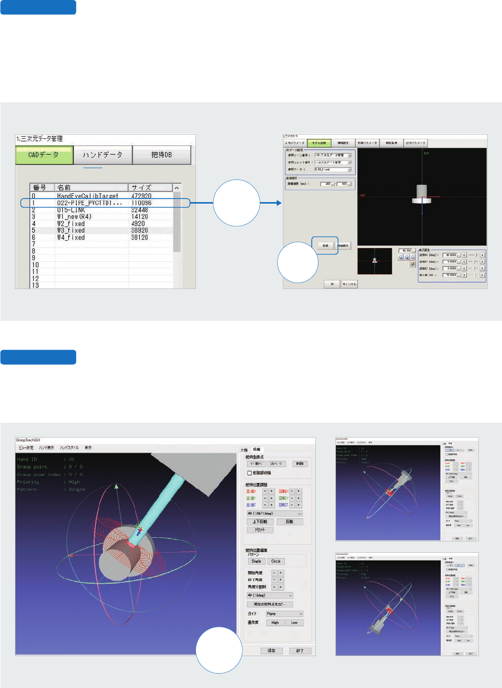 10 只需读取部件的 CAD 数据,就能自动创建 3D 搜索模型。 此外,部件的 CAD 数据、拾取点的设定数据以及各类机械臂的数据,均可实现全场景通用的批量管理。 如需添加品种,可直接复制场景数据,利用批量管理的 CAD 数据,创建新增品种的搜索模型。 无需实际操作机器人,即可通过部件的 CAD 数据,设定拾取位置。 在 3D 图像上设定拾取位置 可设定多个拾取点 批量管理 CAD 数据、机械臂数据、拾取数据 数据管理画面 根据 CA…