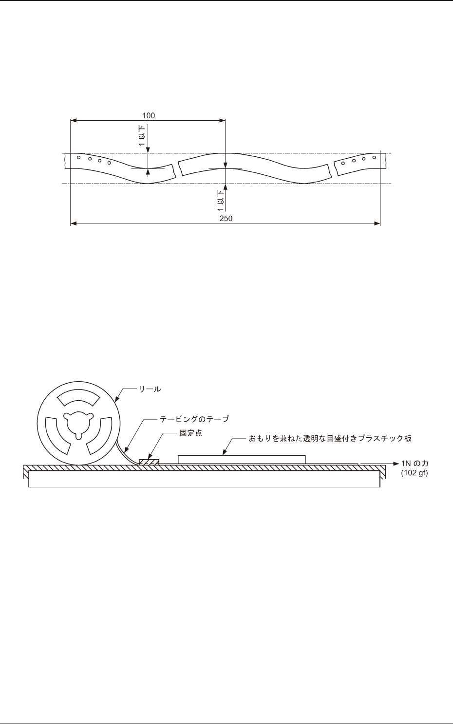 テープの片端を固定し、他の片端に 1 N (102 gf) の力を加えて引っ張り、