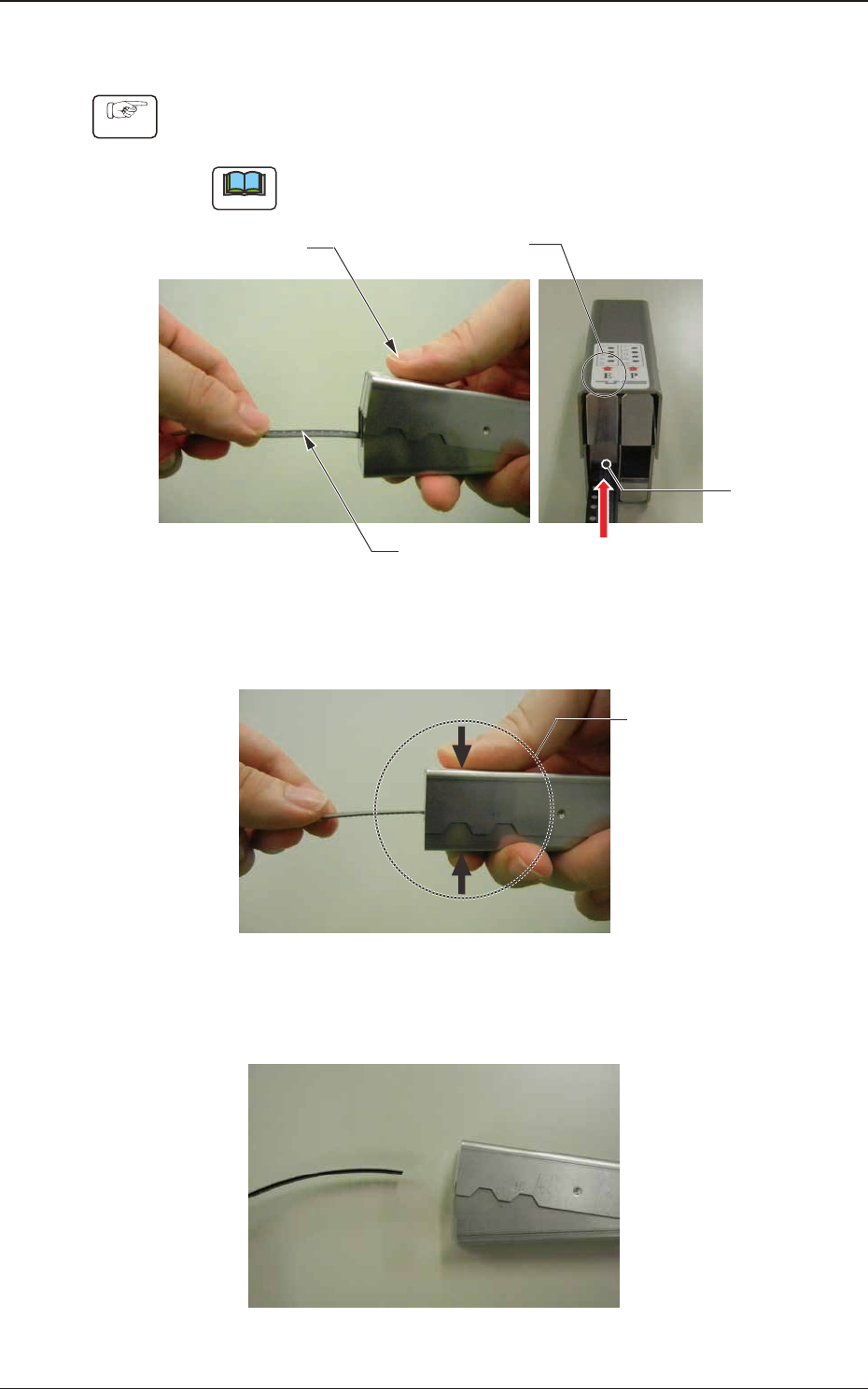 2.4.2 エンボステープの先端処理手順 手順 (1) エンボステープの時は冶具の左側 (E) を使用し、テープ先端が突き 当たるまで、冶具に挿し入れます。 ノート 冶具はラベルが付いている方を上にして持って下さい。 ラベル 突き当たる まで挿し入れる 左側 (E) を使用 テープ Fig.B26 (2) 冶具を押し込み、テープ先端を潰します。 治具を押し込む Fig.B27 (3) 先端処理完了。 Fig.B28 2.4テー…