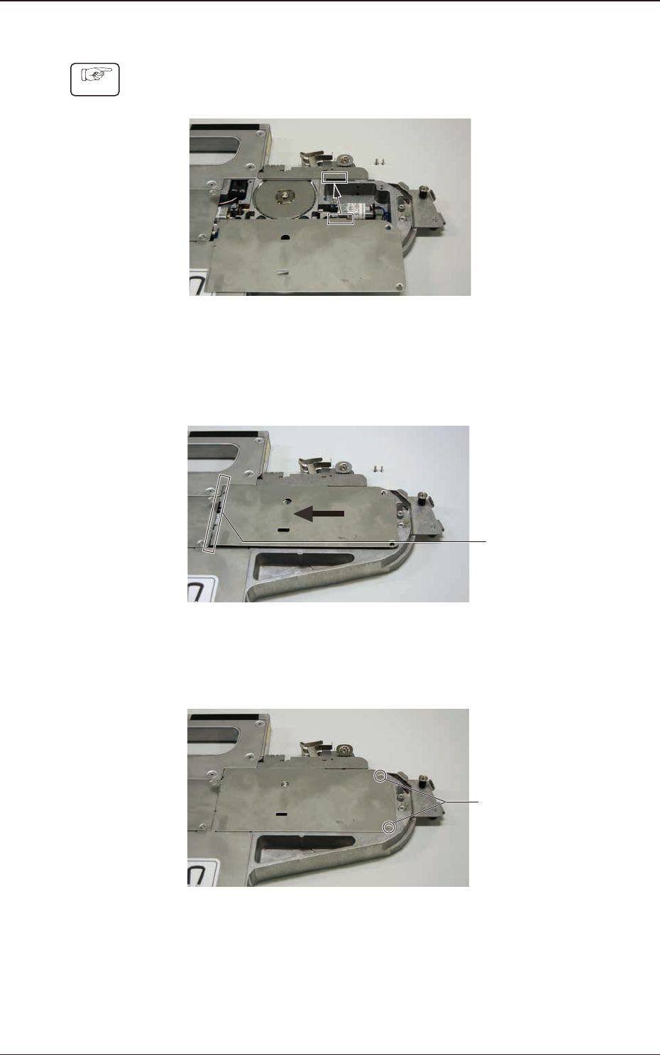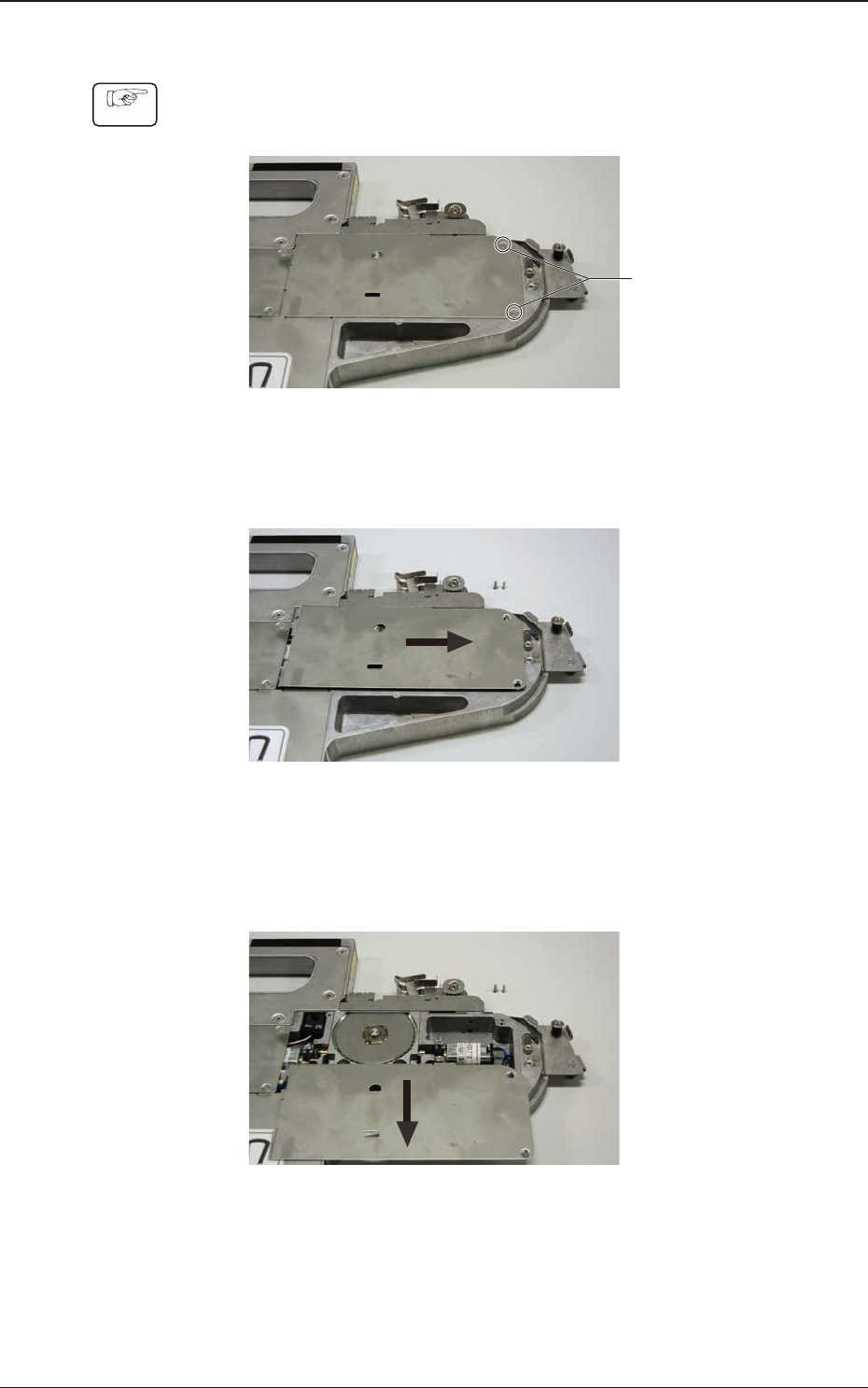 5.5メンテナンス方法 5.5.1.3 カバー LD 取外し手順 手順  (1) カバー LD を固定している皿ネジを取外します。(2 か所 ) 皿ネジ (2 か所 ) Fig.E15 (2) カバー LD を矢印右方向にスライドさせます。 Fig.E16 (3) 次いでカバー LD を矢印下方向にスライドさせて、カバー LD を取外 します。 Fig.E17 1407-001 OM-1832 5-12