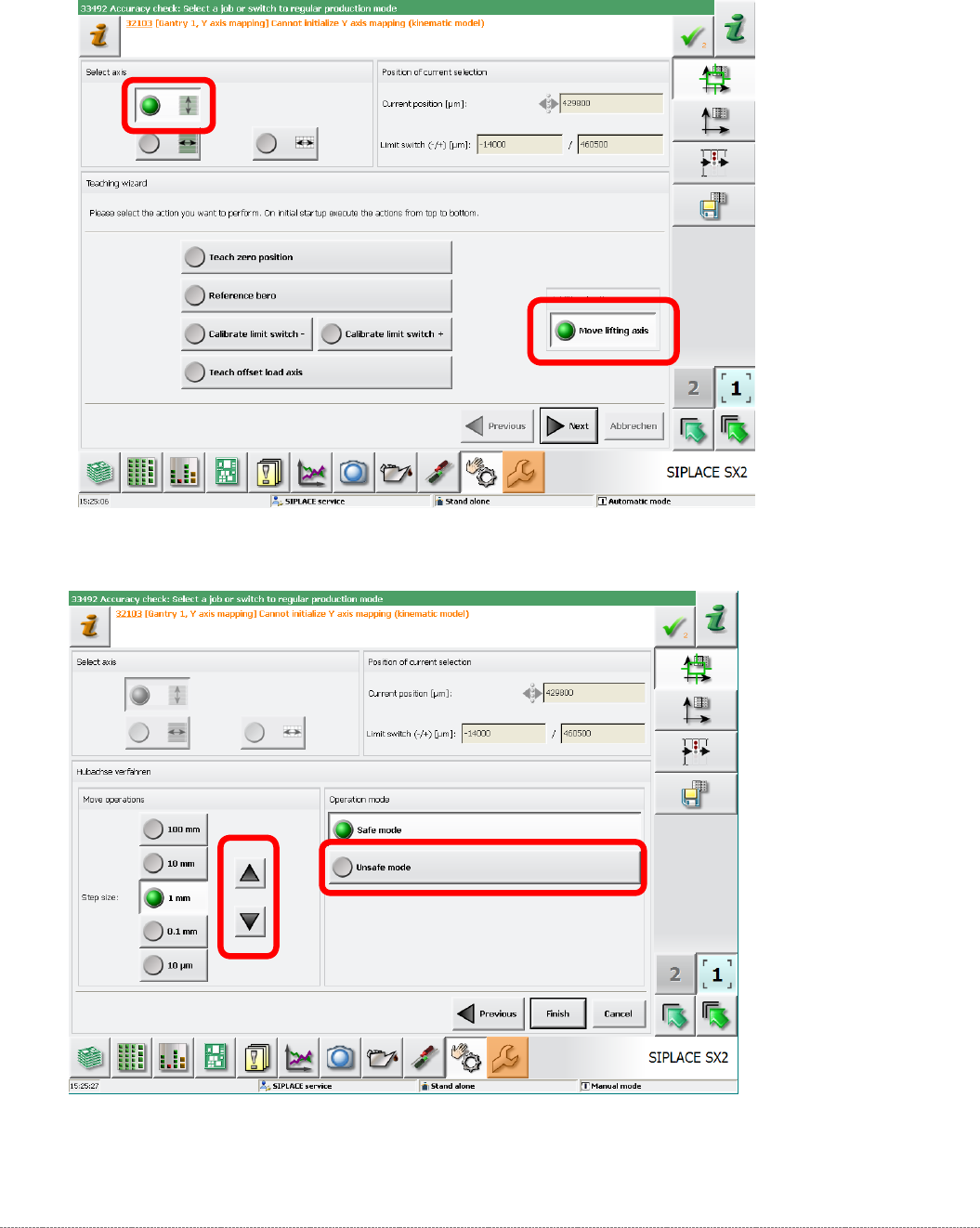 …… ⇨ Unsafe Mode wählen ⇨ Select Step size ⇨ move lift axis with arrow keys.