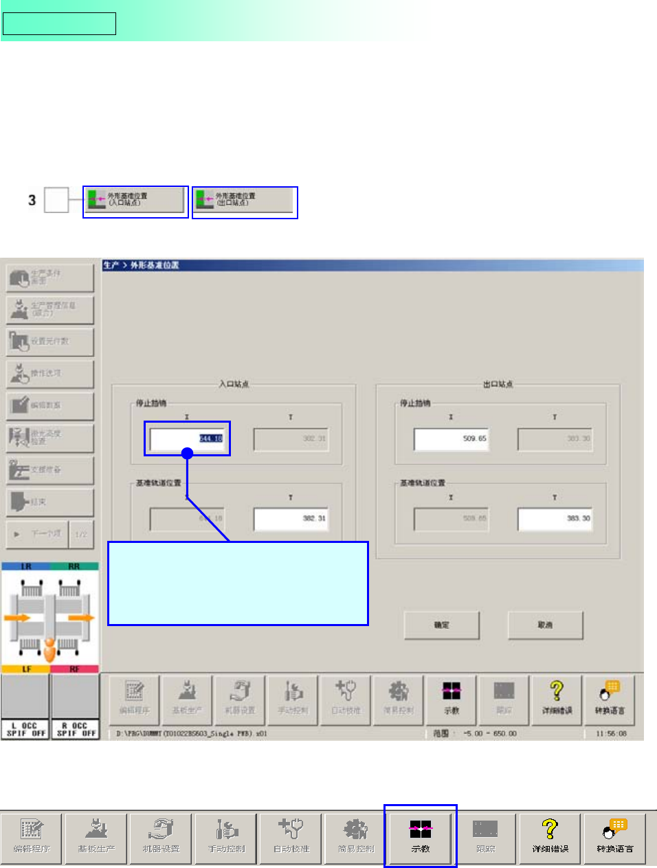 操作手册 Rev00 2- 13 在 〈步骤 2〉 变更了挡块位置时, 基板的外形基准位置 (停止位置) 会出现变化, 需要重新对准 「外形 基准位置」 。 ※ 必须事先「搬入」基板。请参见「支援准备 2 确认基板传送」 。 ① 请按下按钮「外形基准位置」 (入口/出口站点请都按同一操作方法操作) 。 ② 显示「外形基准位置」设置画面。 ③ 请按下画面下的按钮「功能栏」-「示教」 。 支援准备 3 取得外形基准位置 请在画面上把光标对准…