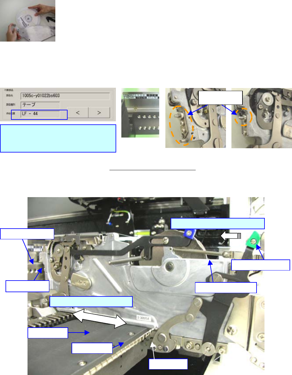 例)把安装有元件名“1005c-y01022bs603”元件的带状送料器,安装在左前的送料器台架 44 号上。