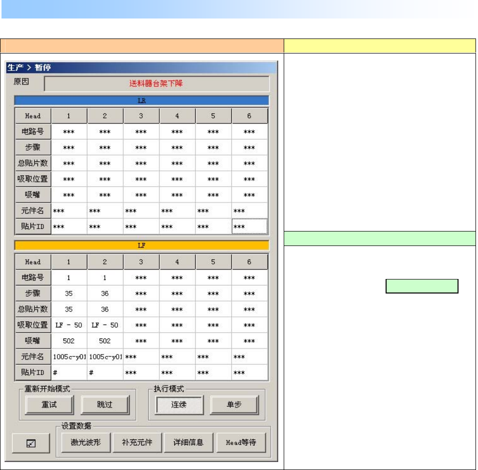 操作手册 Rev00 3- 10 生产运行中(XY 轴移动中)打开保护盖时,显示如下画面,装置进入暂停。 发生错误的画面 错误的原因,原因 ①生产运行中送料器台架下降、 ②上升台架的气缸出现故障。 处理错误的方法 请正确地安装统一更换台车,把 送料器 台架上升之后, 按下 , 重新开始生产。 在送料器台架下降状态下,不能 开始生 产/重新开始生产。 3-9 送料器台架下降 (仅限附带统一更换台车选购项时) 开始开关