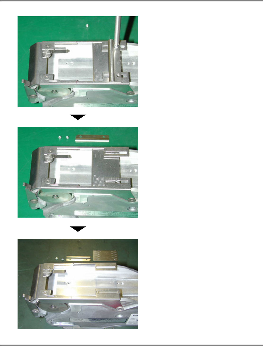 Intelligent Tape Feeder 操作手册 7.1 关于故障 Page 7-30 INTF-C-OMB07-A01-06 B) 附带分离狭缝的进给间距变更板的安装 1. 安装附带分离狭缝的进给间距变更板。 2. 安装编带导轨。 3. 拧紧固定螺钉。 INTF-096P INTF-097P INTF-098P