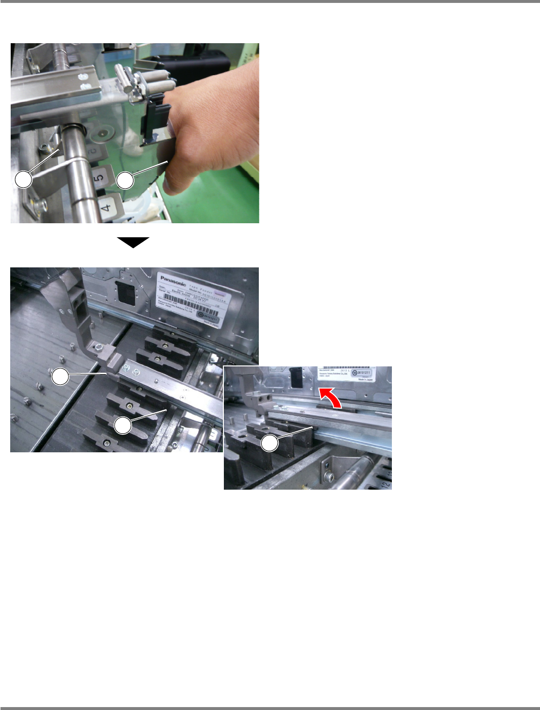 Intelligent Tape Feeder 操作手册 2.1 编带供料器的安装及拆卸的方法 Page 2-6 INTF-C-OMB02-A01-07 2.1.3 专用附件的拆卸方法 ( 使用薄型供料器时 ) 1. 向上拉夹紧把手④, 确认夹紧把手尖端 的挂钩部⑤已经脱落后, 向前滑动专用 附件。 2. 使专用附件的 T 型插槽部①向前滑动 到供给部槽沟的止动器⑦位置后, 在止 动器⑦的位置上稍微向上抬起后再向 前滑动。 INTF-0…