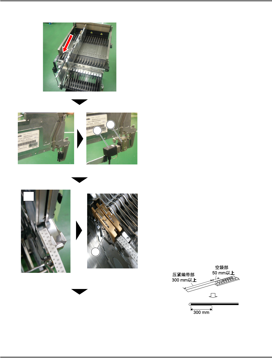 Intelligent Tape Feeder 操作手册 2.2 编带的设置 INTF-C-OMB02-A01-07 Page 2-23 2.2.3 8 mm 薄型单供料器的编带安装方法 1. 从供给部的沟槽中抽出约三分之二的 8 mm 薄型单供料器。 2. 将中继连接器 ⑫ 安装到电源供给连接 器①上后,连接到供料器上。 3. 将载体编带从编带后方的编带插入口 ( A ) 插进后,一直贯通到编带压盖③附 近。 请务必剥去辅助编带。…