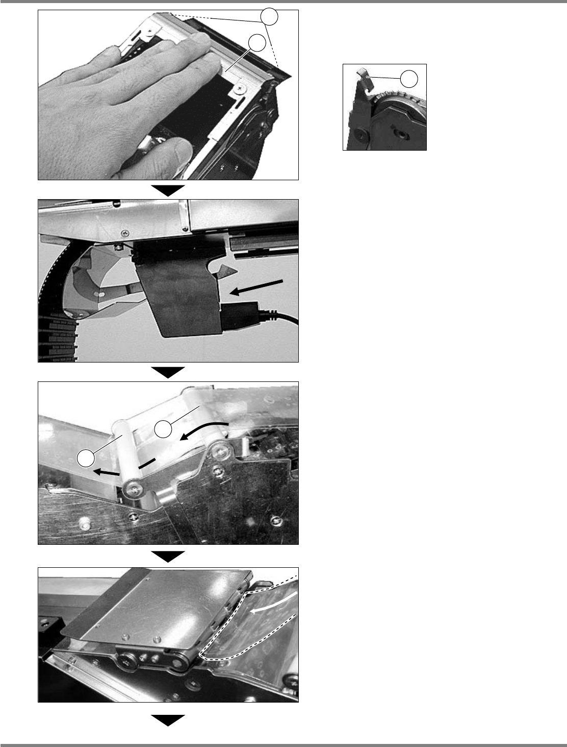 Intelligent Tape Feeder 操作手册 2.2 编带的设置 Page 2-46 INTF-C-OMB02-A01-07 10. 按顶层带导进用开关 , 并卷上一直到 顶层带 绷直。 11. 按编带搬送 ( 正转 ) 用开关 一直到第 一芯片出来。 12. 在离框架尖端 20 mm 左右的位置剪掉 多余的载体编带。 剪掉编带时请握住编带的尖端,以免 编带丢落 在供给部的沟槽上。 INTF-119P 1 I…