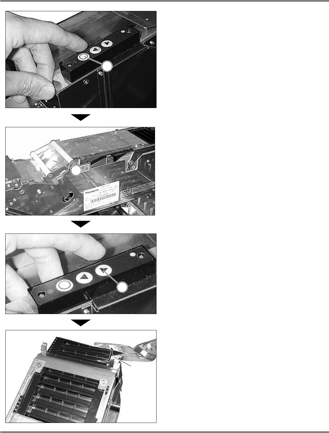 Intelligent Tape Feeder 操作手册 2.2 编带的设置 INTF-C-OMB02-A01-07 Page 2-47 2.2.6 取下编带的方法 8mm 薄型单供料器 当在专用附件上安装有 2 个编带供料器时,请按照下 述 2 ~ 5 的步骤执行操作。 1. 抬起专用附件的把手①后,约滑动 1/2 左右。 不连接电源线。 2. 在按下导杆②的状态下,抽出 5 cm 左 右的顶层带。 3. 用剪刀在顶层带的导滚…