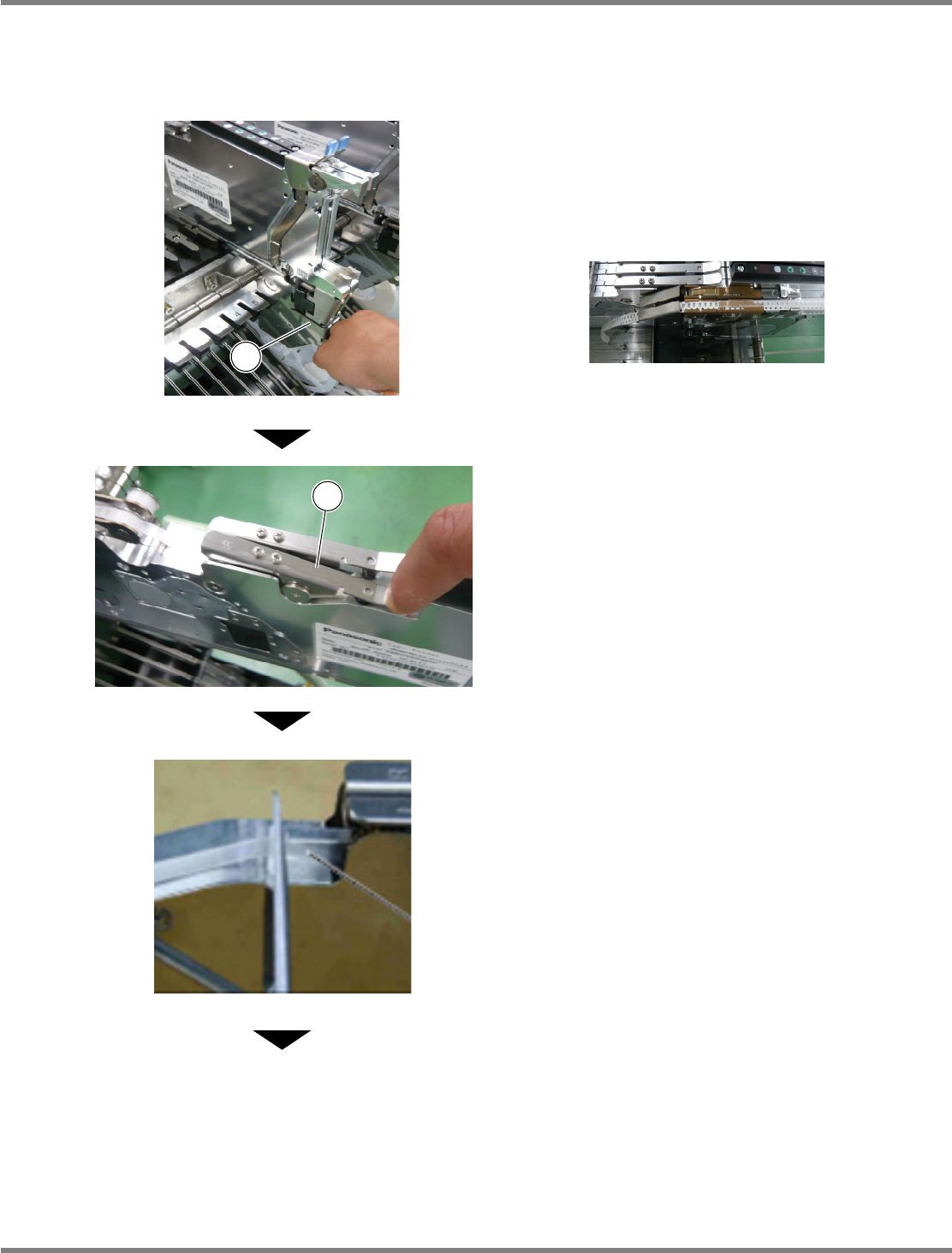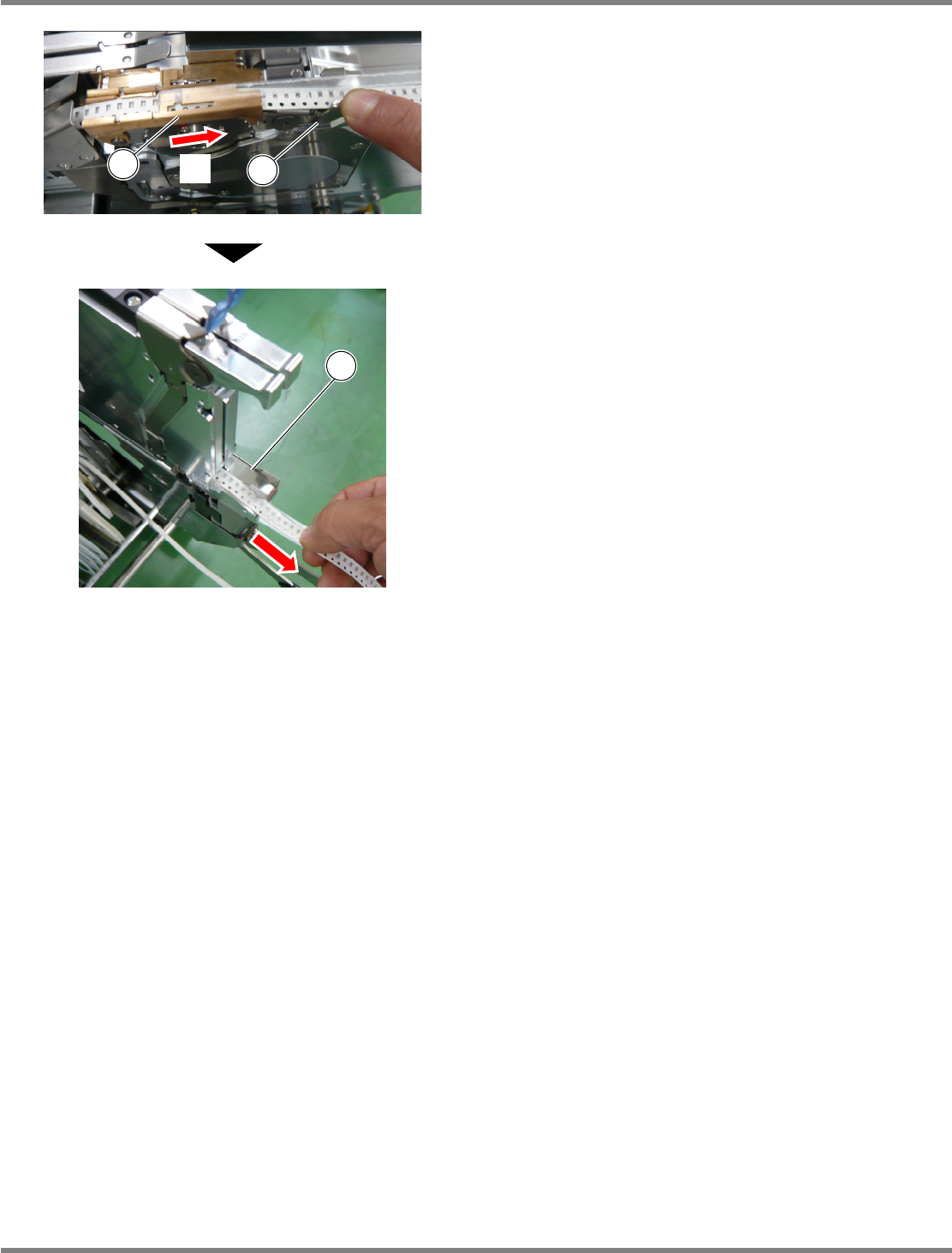 Intelligent Tape Feeder 操作手册 2.2 编带的设置 Page 2-48 INTF-C-OMB02-A01-07 4. 按下插锁④, 向箭头 A 方向抽出压紧编 带与载体编带后,从编带压盖③中取 出。 请务必除去残留在芯片口袋的芯片。 5. 从位于编带供料器后方的编带插入口 ⑤向后方抽出编带。 INTF-012P 5 INTF-012P A 3 4
