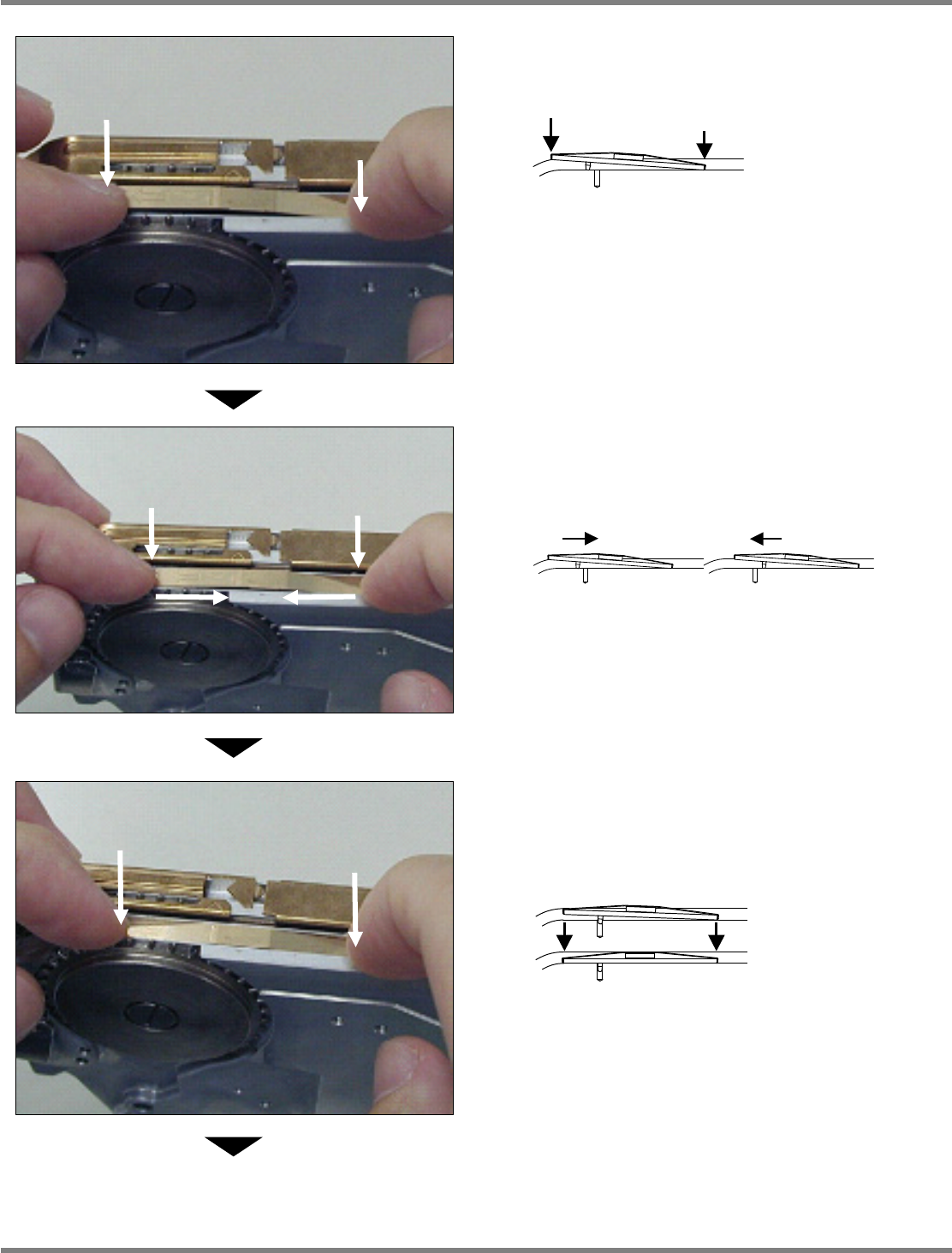 一边压住区块后部,一边把前部压下到