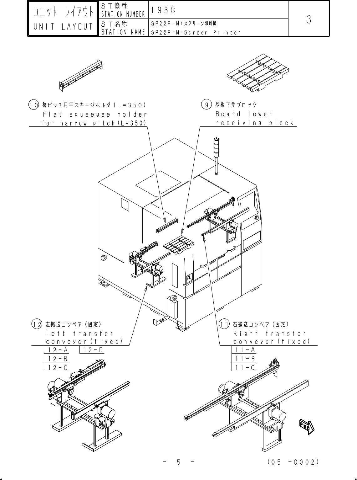 9 1054C5M0000 基板下受ブロック:SP10P-MA2 Board lower receiving block : SP10P-MA2 1 73 10 15D7C1M0000 狭ピッチ用平スキージホルダ(L=350):SP11P-MA Flat squeegee for narrow pitch: SP11P 1 75 11 11DKC2M0000 右搬送コンベア:SP22P-M Right transfer con…