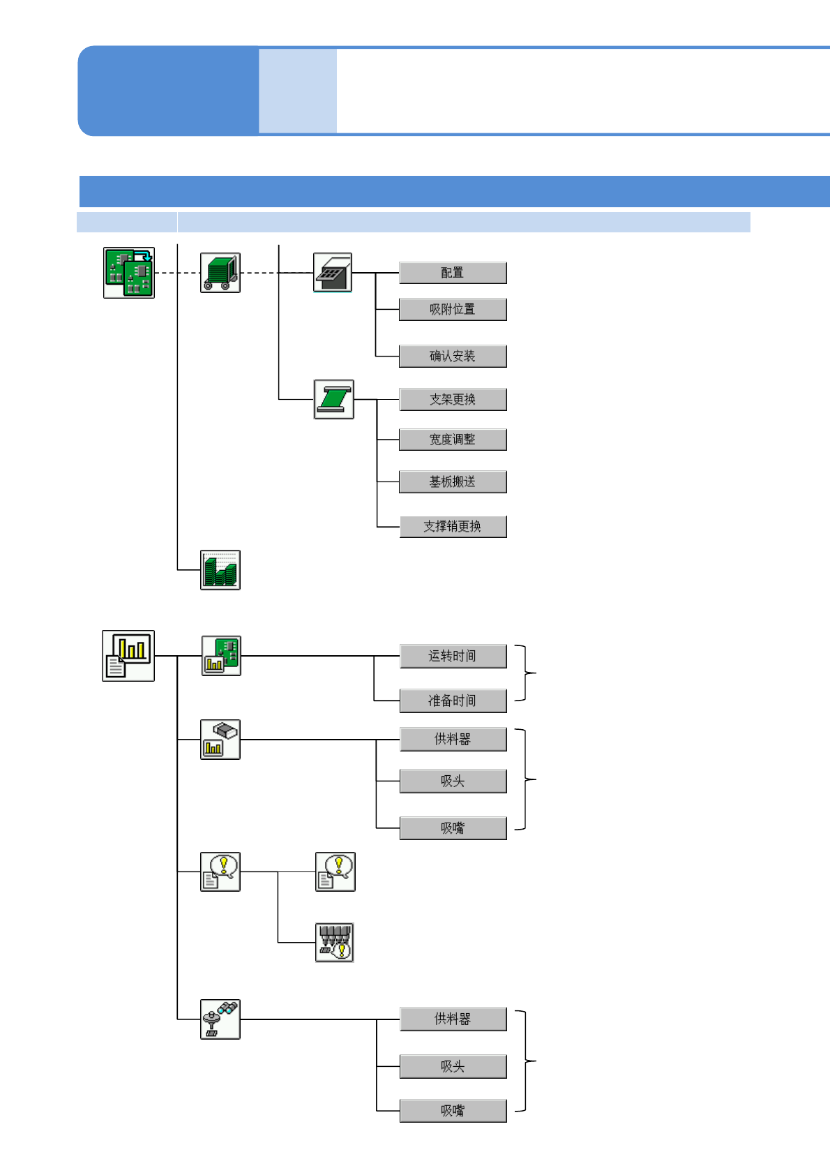 NPM-D3A EJM6EC-MB-02O-0 2 第 1 阶层 第 2 阶层 第 3 阶层 第 4 阶层 2-2-2 -6 余数监视器 确认生产线上的各工作台的元件用完 信息。 确认吸着状況。 吸着监视器 状況监视器 显示运转中的生产信息,零部件用完 信息,以及其他的各类信息。 生产菜单 ( 生产中 ) 连续准备 管理各工序生产前的个别准备作业。 读入机器数据、保存机器参数等文件 操作。 文件操作 显示各吸嘴位置的机器数据。 准备零部…