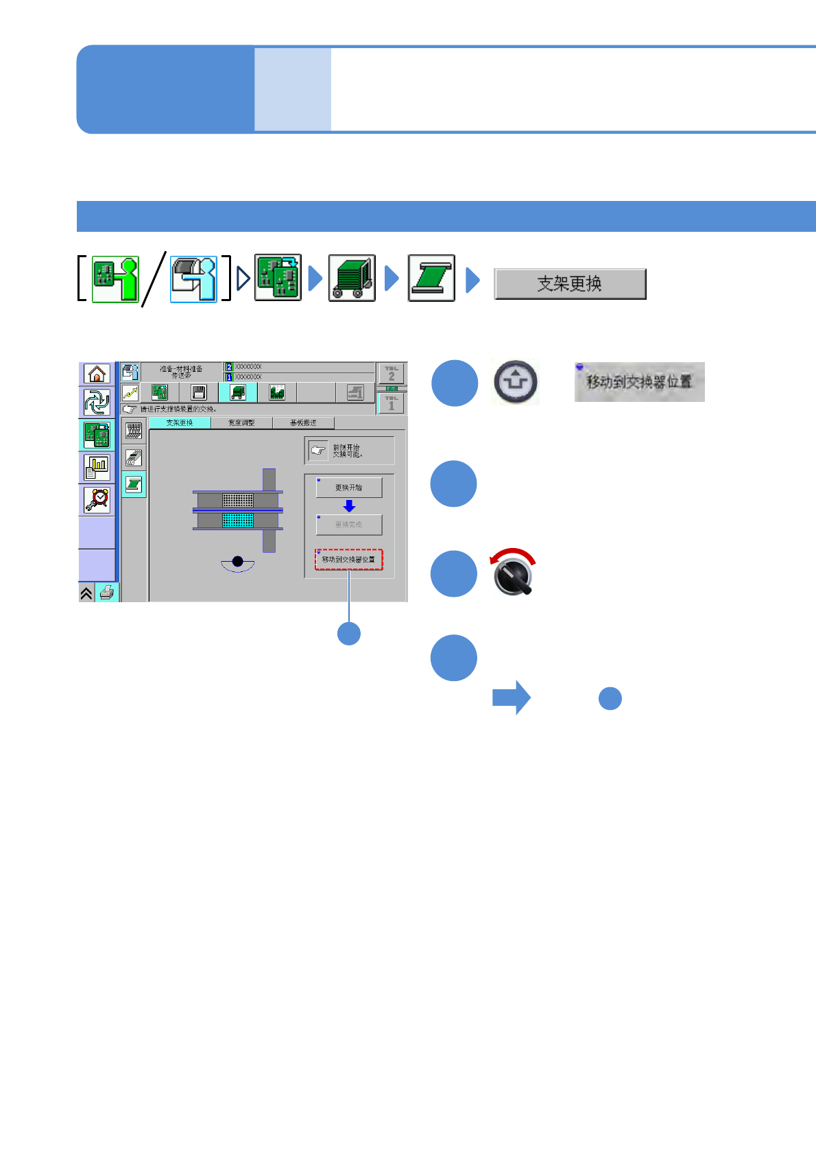 NPM-D3A EJM6EC-MB-02O-0 2 2-5-1 -1 + 1 3 4 5 至步骤 2 个别 准备 操作篇 2-5-1 X 轴自动移动的方法 ( 前侧 / 后侧的 X 轴驱动单元移动到 各 自的中央位置 ) 对自动移动和手动移动 X 轴的方法进行说明 。 卸下交换台车 (→ 『维修保养篇』 P.3-2) 吸嘴交换器的更换 1 伺服开关置于 OFF 打开安全盖 1