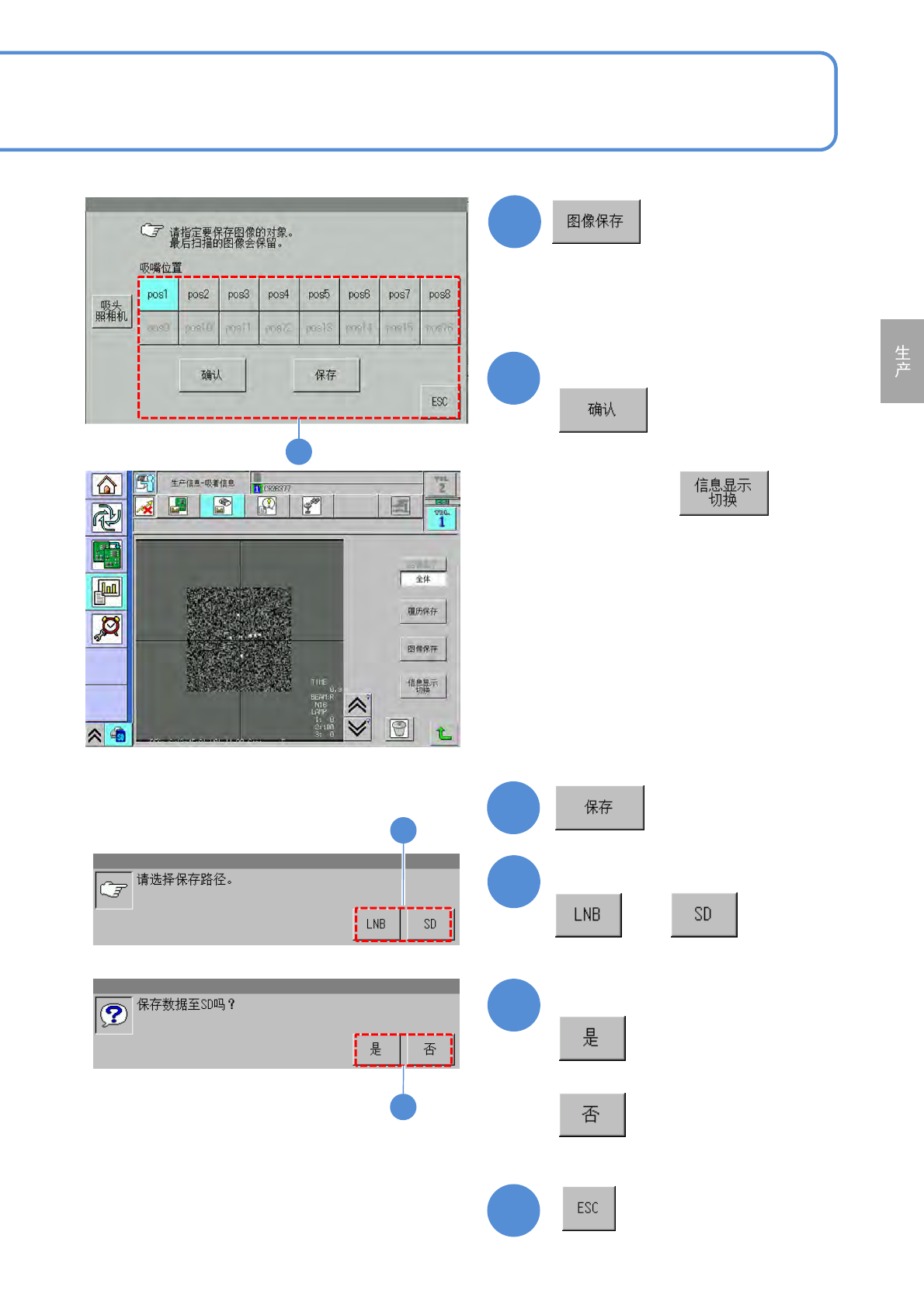 NPM-D3A EJM6EC-MB-03O-0 1 生产 信息 3-2-4 -3 贴装头的吸着信息 2 操作篇 3-2-4 4 5 6 确认提示 或者 确认提示 ■不保存数据时 2 ( 显示识别错误的图像信息 ) 全体 指定 3 选择图像显示 ●所选择的工作台的所有图像按照最新 顺序显示。 : 显示所有图像。 : 显示在前画面指定的料 架地址的图像。 B C A 3 4 7 D 图像被清除。 切换前后的图像。 返回原来画面。 A B C…
