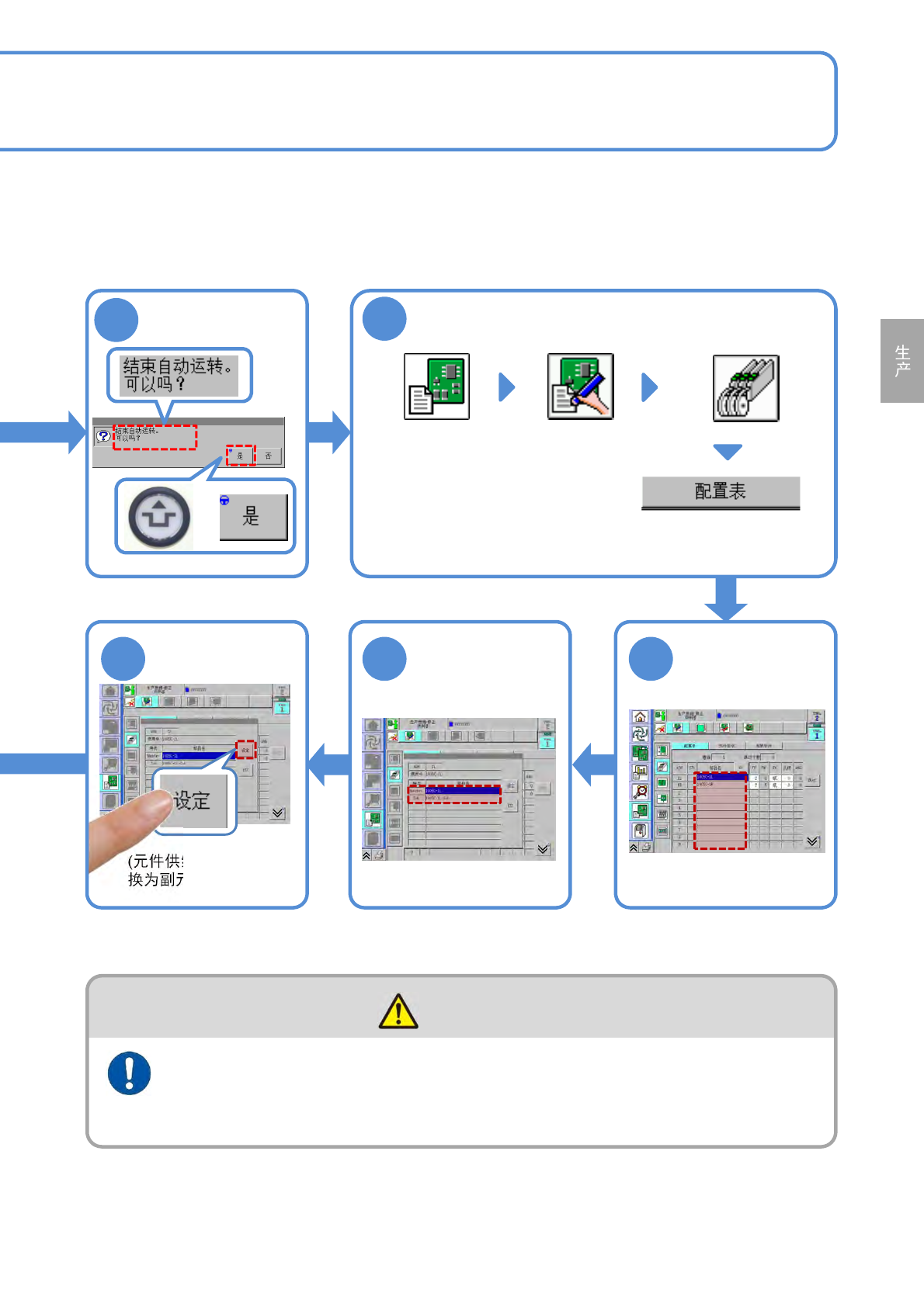 NPM-D3A EJM6EC-MB-03 O-01 ACTIVATION 3-3-1 -1 元件的 补充 代替元件的补充 ( 智能供料器 ) ●请在工程师模式进行操作。 ●将通常使用的元件登录为「主元件 」,而将代替元件登录为「副元 件」, 发生元件用完时,可以使用代替元件。 ・ 登录方法 ( → [NP M-DGS] 使用说明书 6 章 ) ( 显示元件用完的提示 ) 2 10 9 8 或者 卸下主元件的供 料器 将副元件的供料器 安…