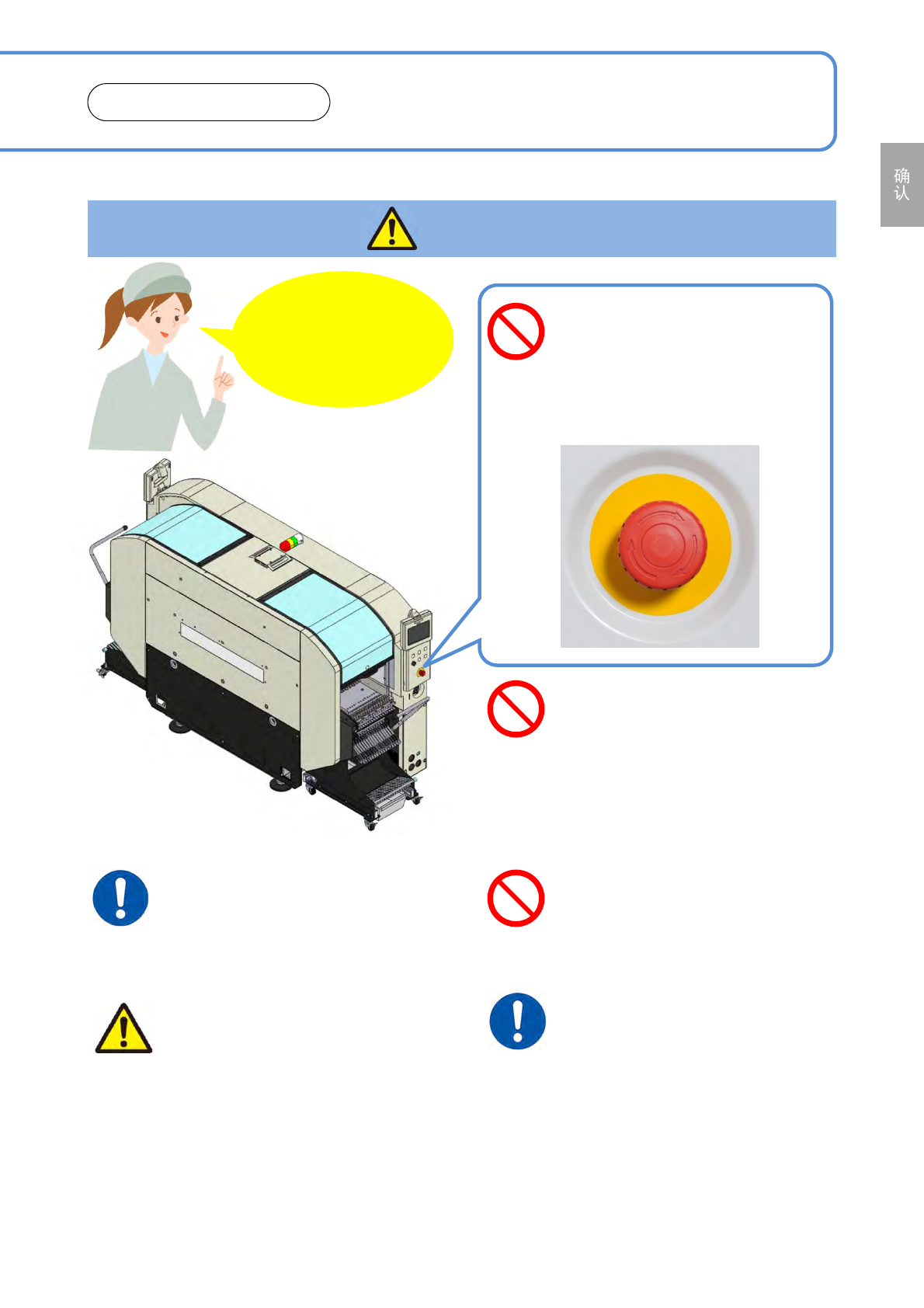 NPM-D3A EJM6EC-SF-01N-02 请勿在设备、周边器材、可动 部上放置其他物体或者站立在 上面 ( 重物掉落引起破损或者被夹住,可能受 伤 ) ●安全盖、交换台车等 1-1 -8 维修保养时,请戴工作帽或安 全头盔以及保护眼镜 ( 可能受伤 ) ●马达或电气箱等。 搬运供料器时,请注意操作 ( 如果掉落,可能受伤或者腰痛 ) ●请根据使用说明书正确操作。 请勿撞击电气机器 ( 造成触电或漏电 ) ●马达或电气箱等。 紧急…