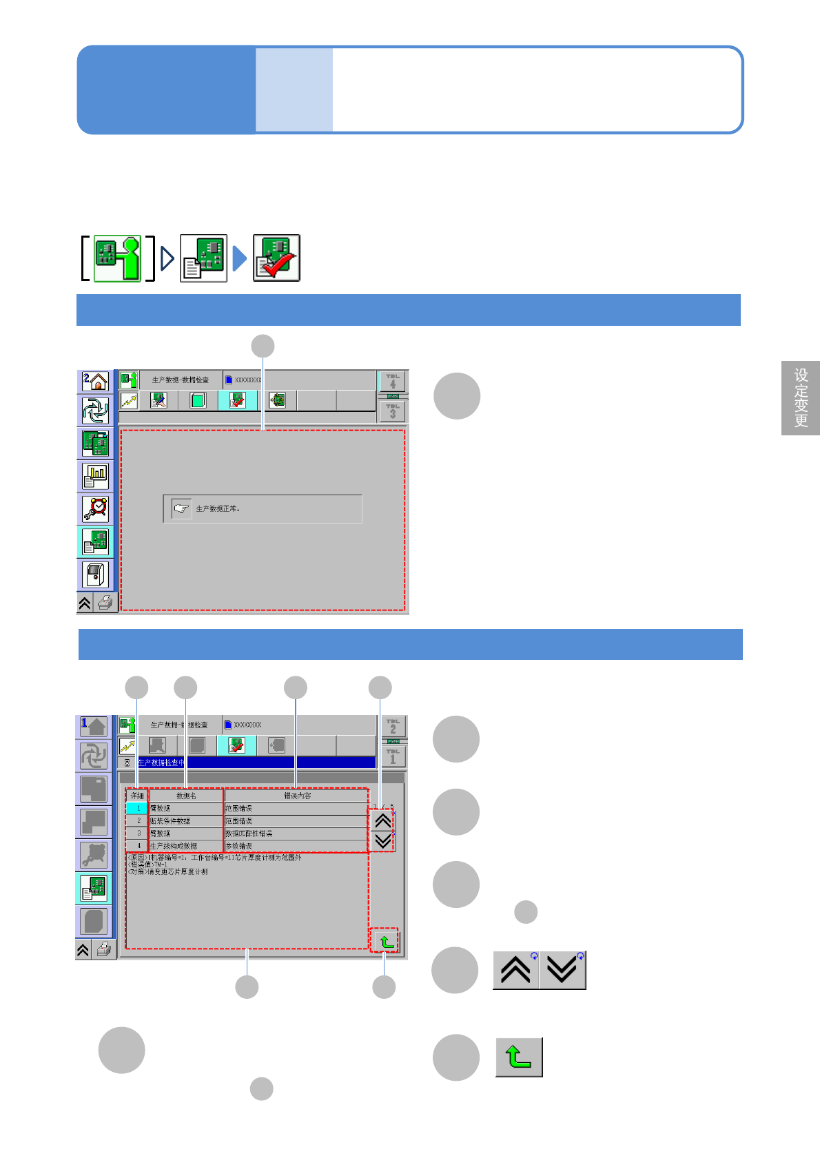 NPM-D3A EJM6EC-MB-04O-0 2 数据 修改 操作篇 4-1-16 对生产数据的确认方法进行说明。 ●对象数据包括可以变更、不可变更 、非表示的所有对生产有影响的 数据。 ●根据设定不同,也有不进行确认的 数据。 确认结果 A B C D F E C A B 详细 D E 详细信息 数据名称 返回原来画面。 F 错误内容 A A D ●选择后,在 显示。 数据确认 正常时 显示前后画面。 在 所选择的错误的详细内容。 …