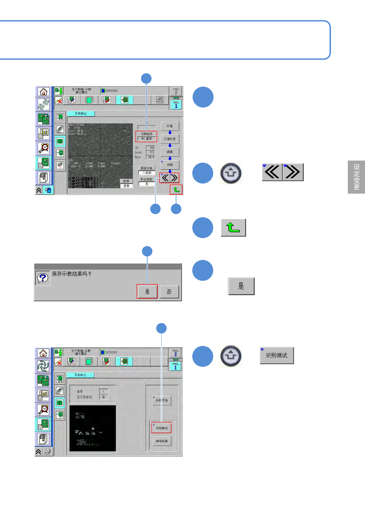 NPM-D3A EJM6EC-MB-04O-0 2 生产数据 校正 操作篇 4-2-10 4-2-10 -3 不良标记识别校正 2 5 5 5 6 ■当变更识别范围的位置或尺寸时 7 ■当变更识别阈值、切换画面、变更标 记类型时 6 8 7 + 8 变更结束后 (进行识别动作) ●调节亮度,使不良标记清晰可见。 ( →P.4-2-1 -4 ‘ 指示 灯值的调整 ’) ■不良标记不在中央位置时 ●不良标记的中心和十字线的中心保 持一致。 …
