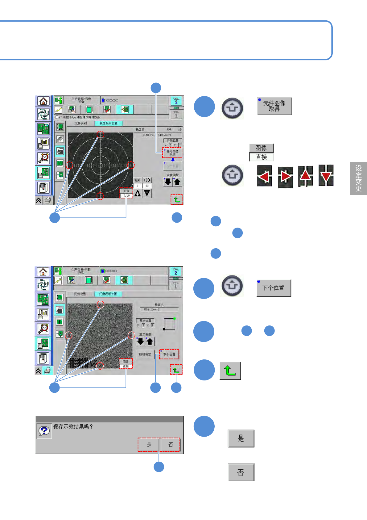 NPM-D3A EJM6EC-MB-04O-0 2 生产数据 校正 4-2-1 1 -3 操作篇 4-2-1 1 托盘吸着位置校正 2 照相机看到的位置是吸着 位置。 3 3 4 + 4 用照相机校正 4 边的中心, 算出吸着位置。 用照相机校正 4 个角,算出 吸着位置。 用照相机校正对角 2 点,算 出吸位置。 ■ 1 点模式时 ■ 2 端模式时 ■ 4 角模式时 ■ 4 边模式时 ( 识别画面扩大显示,开始校正 ) 选择模式。 校…