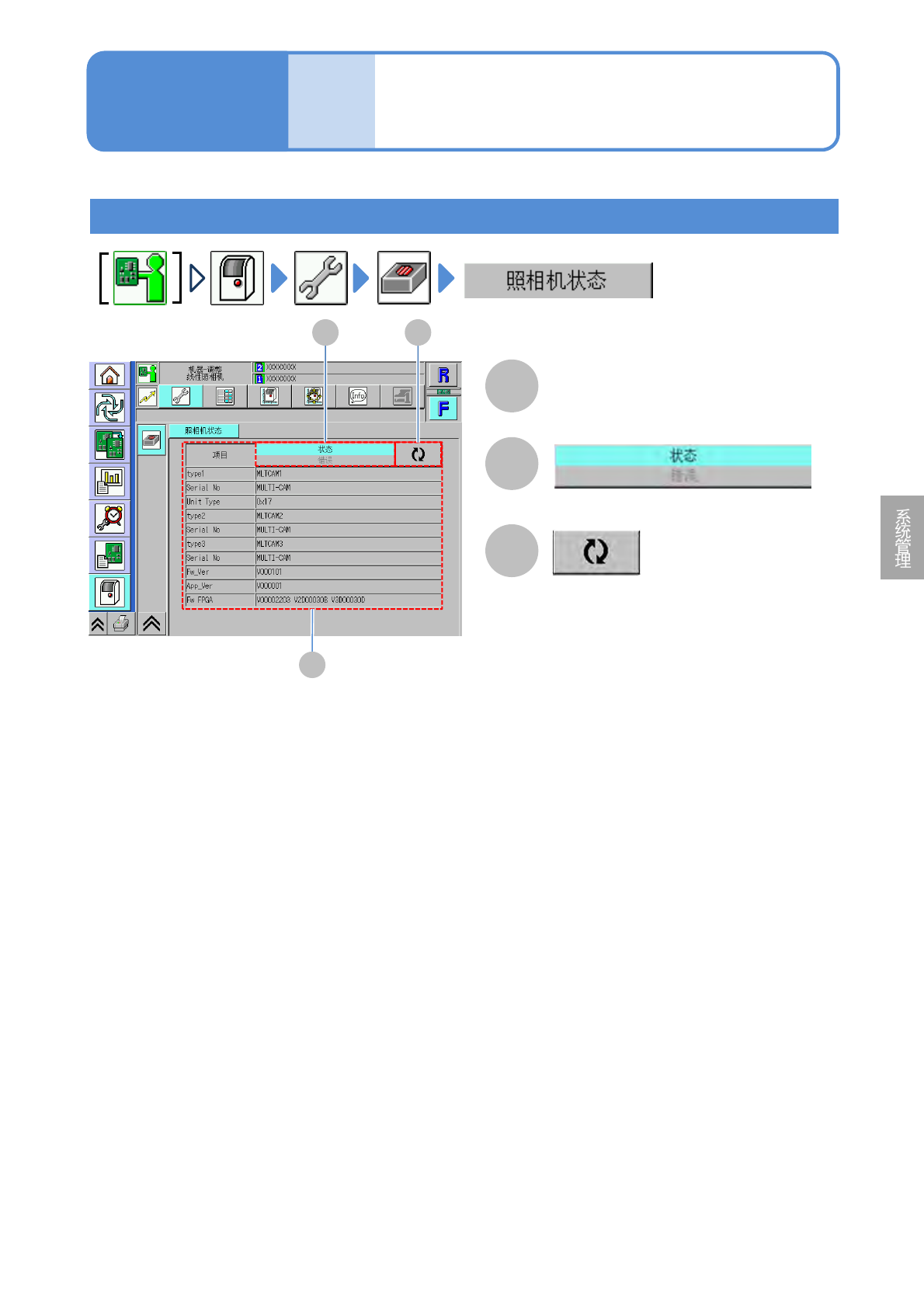 NPM-D3A EJM6EC-MB-05 O-01 确认照相机的状态 A B C 各项目的状态和错误 更新为最新信息。 可切换显示的种类。 单元调整 多功能识别照相机 信息的确认 操作篇 5-2-1 1 5-2-1 1 A B C