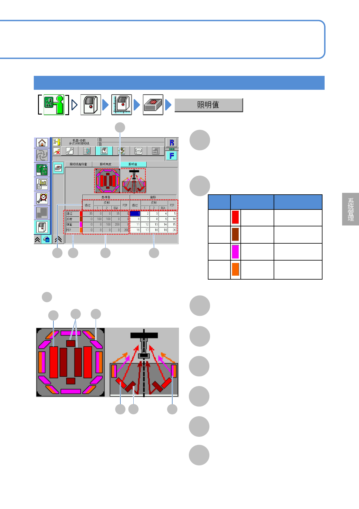 各照明的照明模式的指示灯基准值。