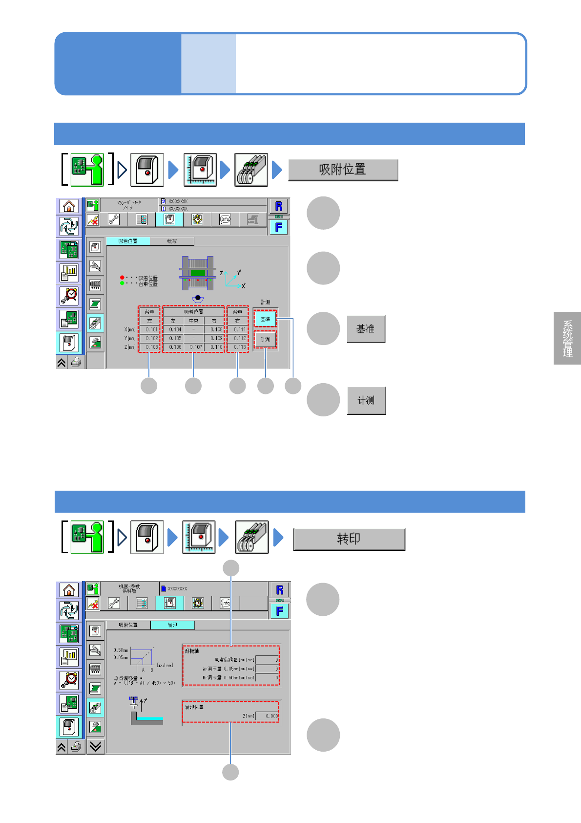 NPM-D3A EJM6EC-MB-05O-0 1 机器参数 操作篇 5-3-13 供料器吸着位置 A 台车位置的偏移值 X[mm]/Y[mm]/Z[mm] 左右台车位置的偏移值。 B 吸着位置的偏移值 X[mm]/Y[mm]/Z[mm] 供料器的吸着位置的偏移值。 (X/Y/Z 坐标 ) 供料器吸着位置和 转印位置偏移量的确认 转印位置偏移值 A 刮刀轴的偏移值 B 转印位置的偏移值 Z[mm] A B ●原点偏移量 [pluse] …