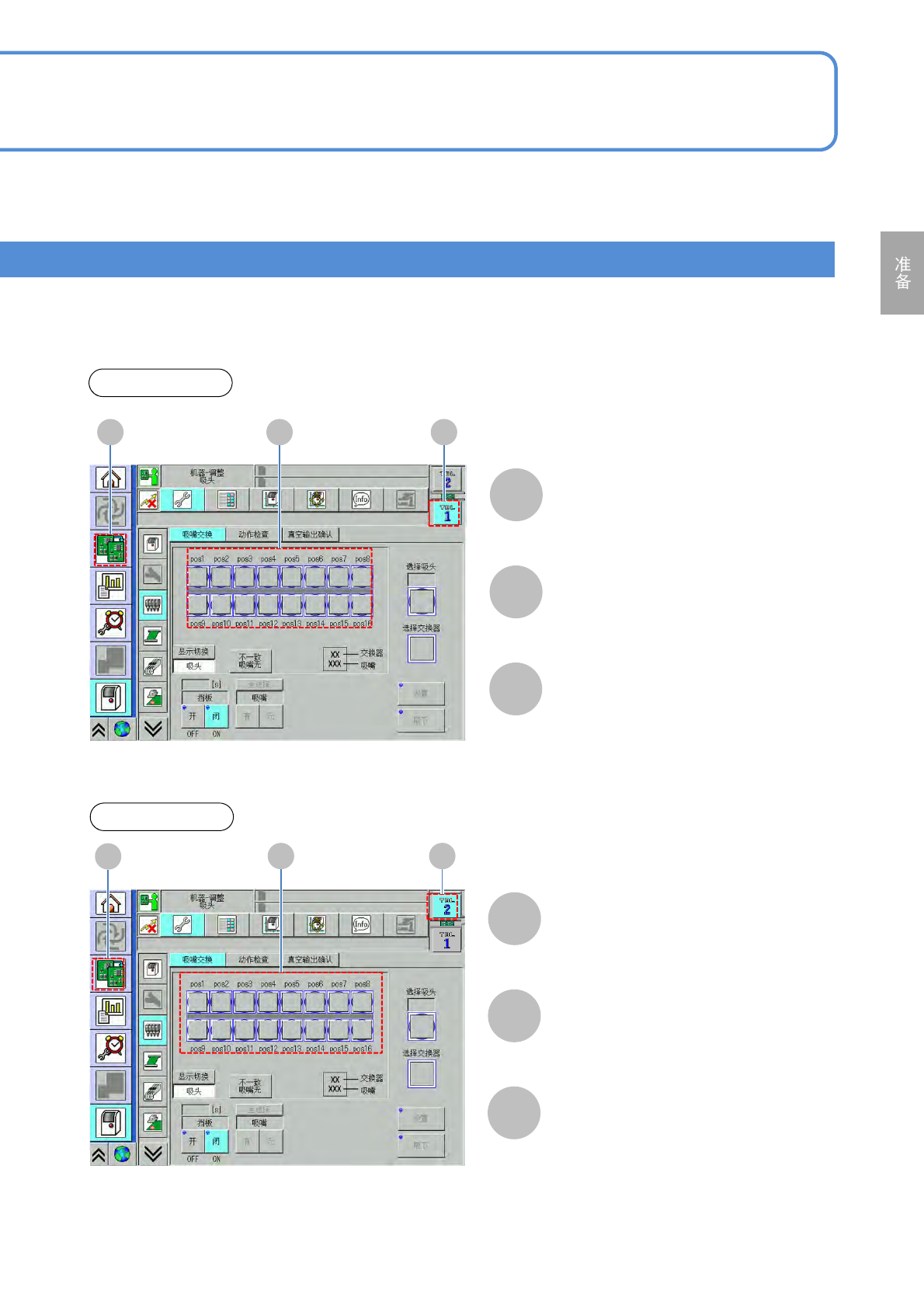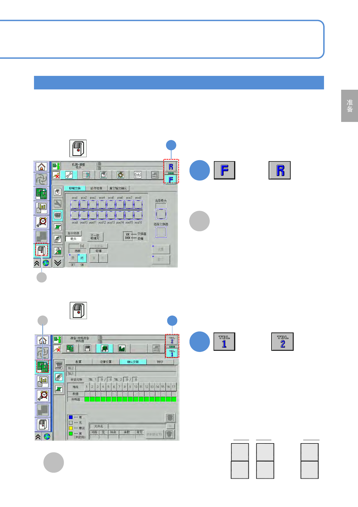 NPM-D3A EJM6EC-MB-02 O-02 工作台 / 基台的切换显示 2 2-2-1 -7 各部位 名称 触摸屏 4 选择前侧或者后侧的工作台后,会显 示工作台所设定的移载贴装头 ( 轻量 16 吸嘴贴装头、轻量 8 吸嘴贴装头等 ) 。 ■基台的切换显示例子 前侧工作台 吸嘴状态图 前侧 C B A [ 机器菜单 ] A B C 后侧工作台 后侧 C B A [ 机器菜单 ] A B C 吸嘴状态图 操作篇 2-2-1